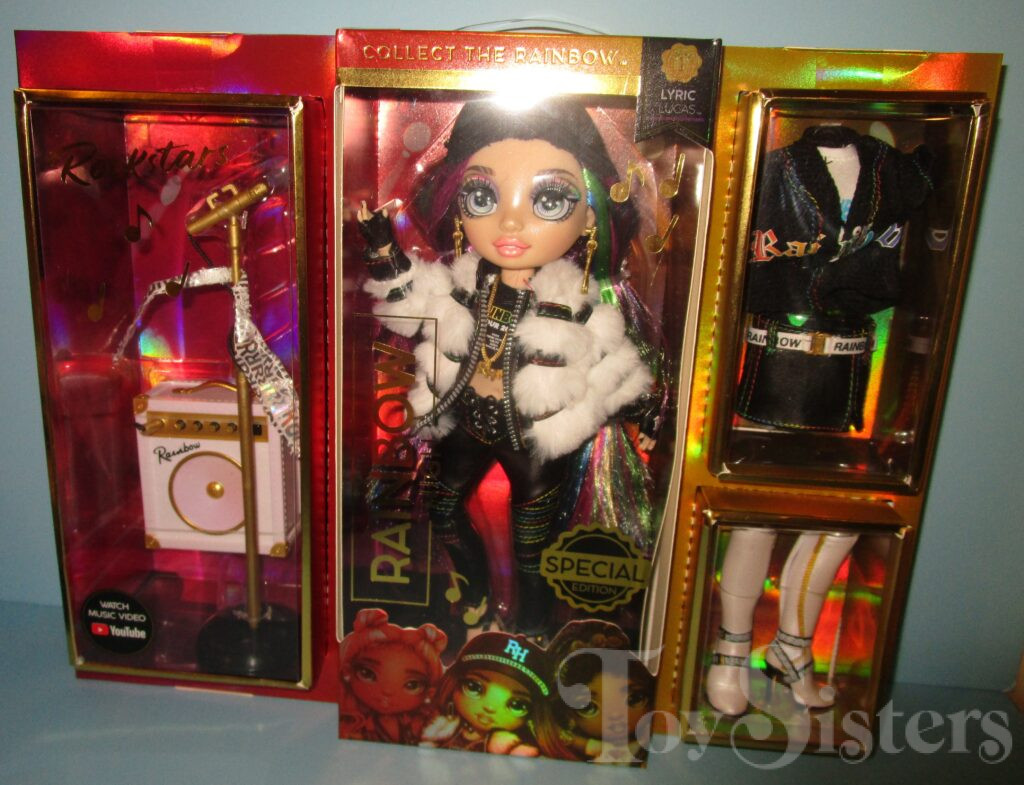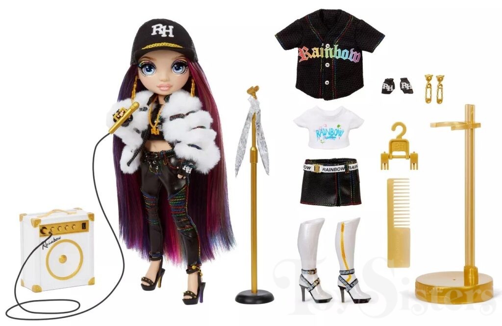 Lyric Lucas was released in 2021 by MGA. She comes with an extra fashion, microphone, mic stand, AMP, coat hangers, stand, and comb. In the US, she was sold exclusively at Target stores. To return to the Rainbow High Series menu, click here. To return the the Rainbow High Character menu, click here.