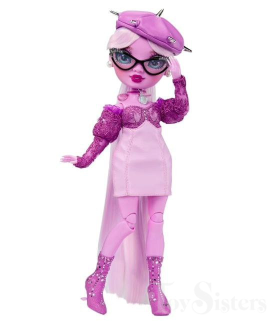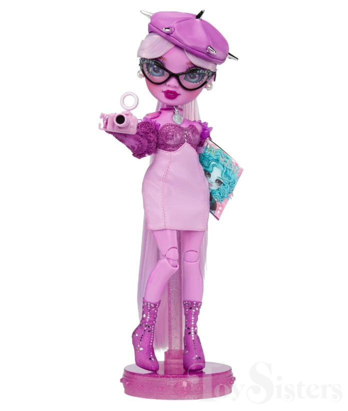 Lavender Lynn was released in 2023 by MGA. She came with a comb, camera, magazine, teacup, and a stand. To return to the Rainbow High Series menu, click here. To return the the Rainbow High Character menu, click here.