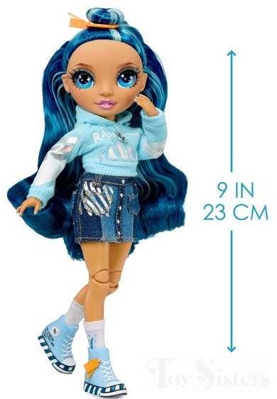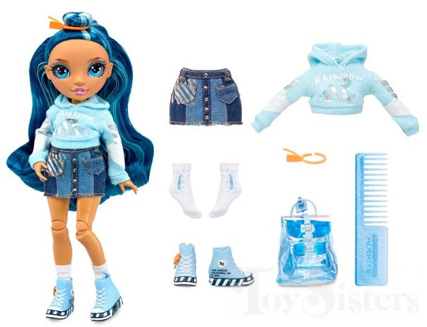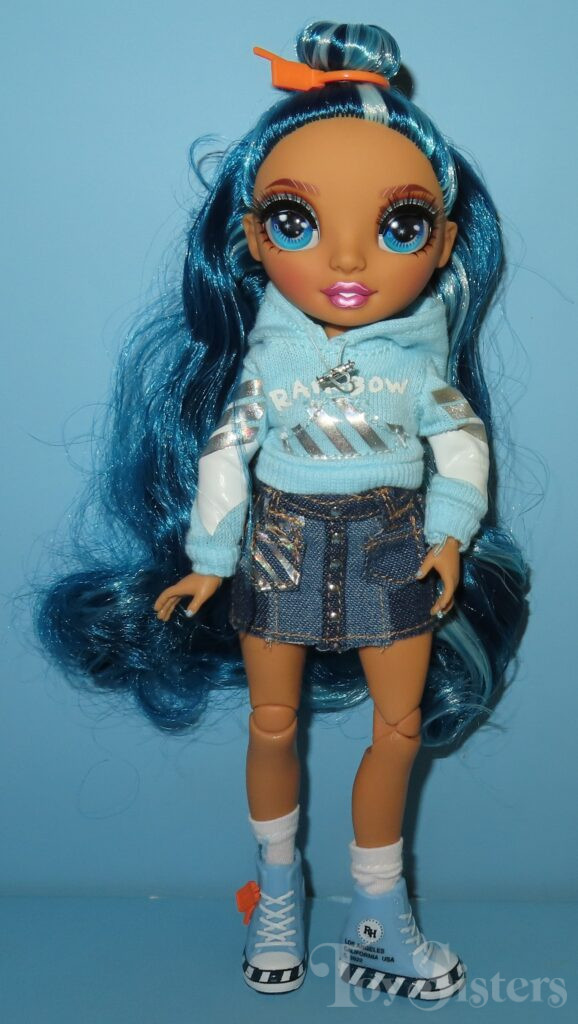 Junior High Skyler Bradshaw was released in 2022 by MGA. The Junior High dolls are smaller than regular Rainbow High dolls. She comes with a comb and bag. To return to the Rainbow High menu, click here. To return the the Rainbow High Character menu, click here.
