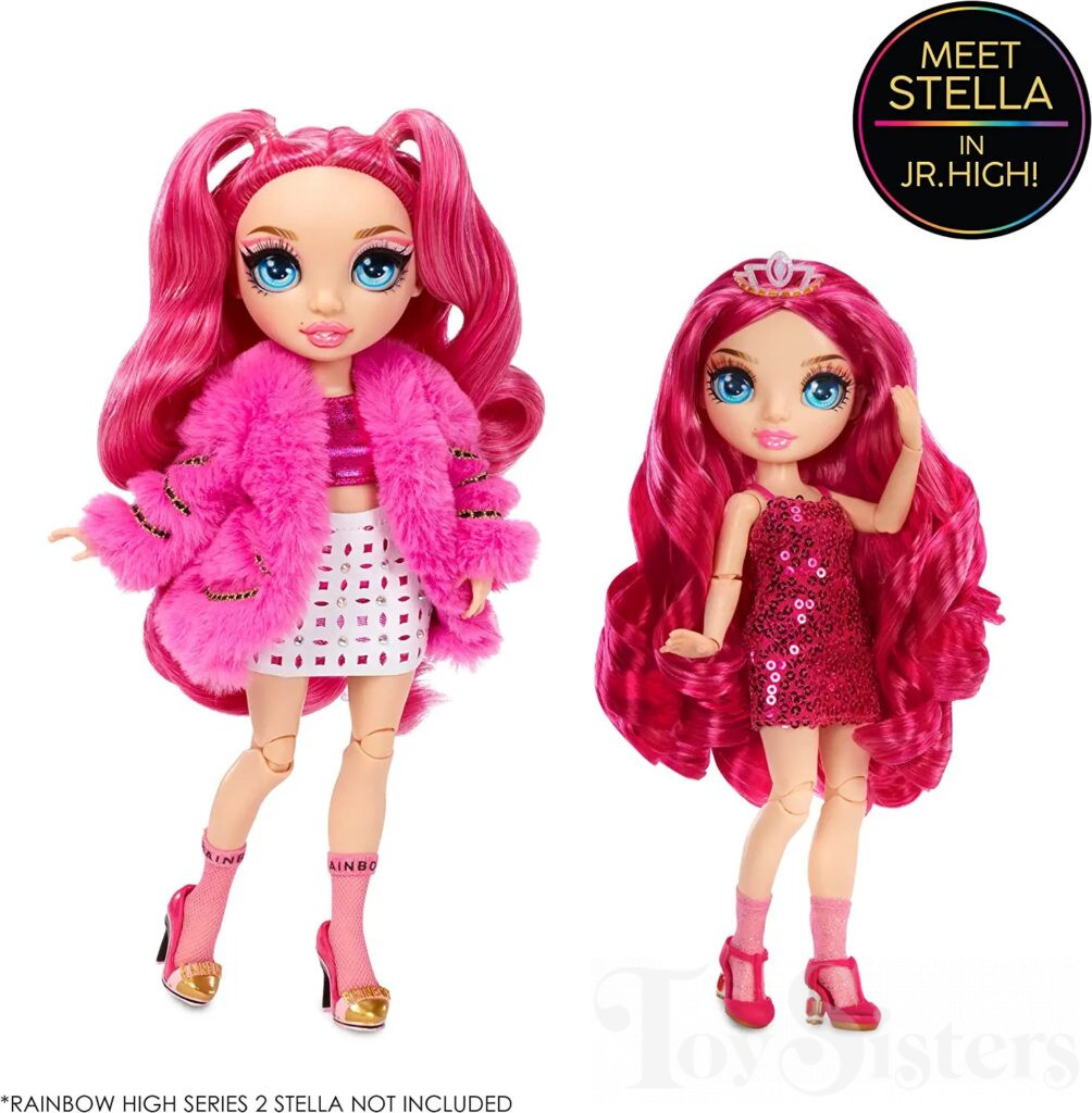 Junior High Stella Monroe was released in 2022 by MGA. The Junior High dolls are smaller than regular Rainbow High dolls. She comes with a comb. In 2023, for Black Friday at Walmart stores, this Stella was released again packaged with her Regular version. To return to the Rainbow High menu, click here. To return the the Rainbow High Character menu, click here.