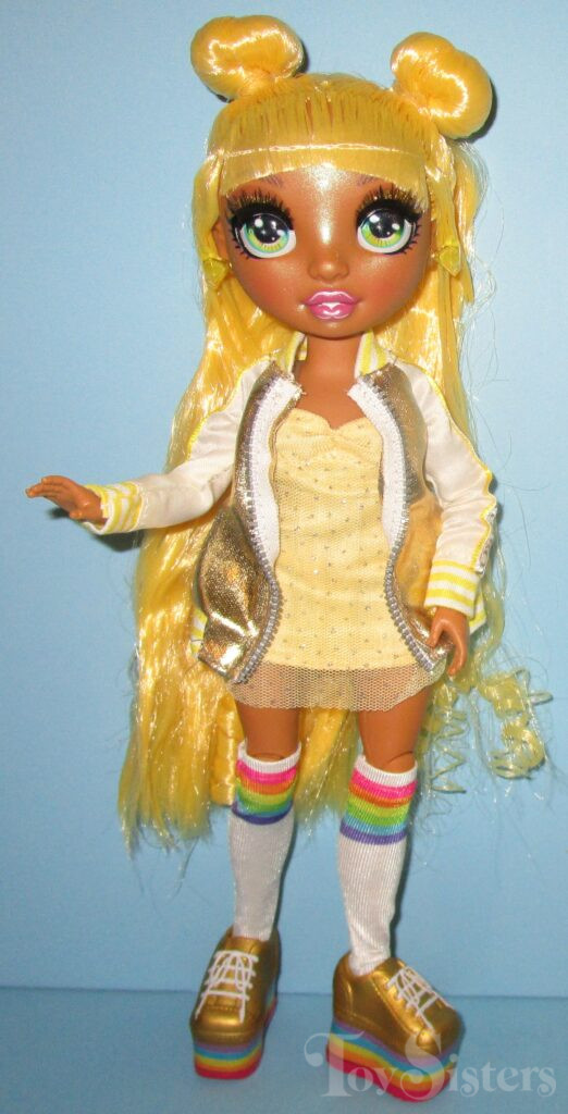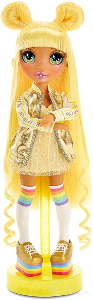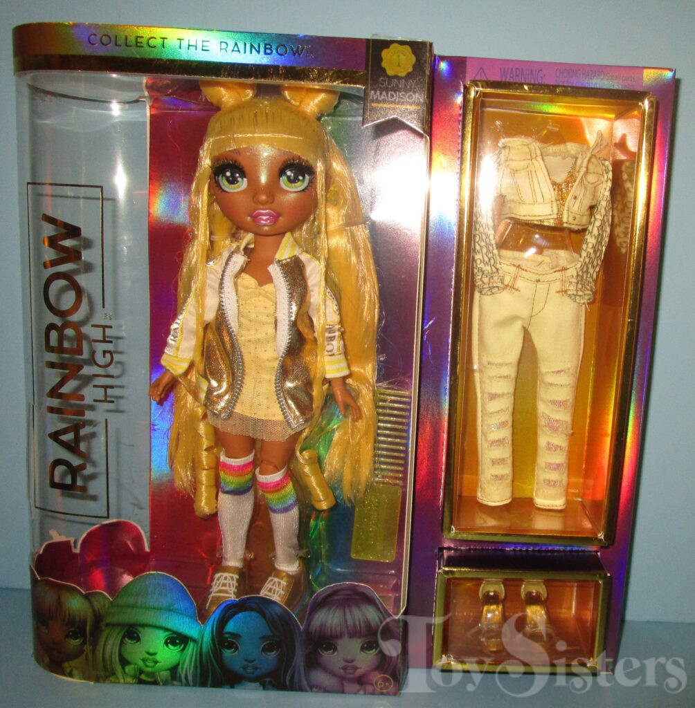Wave 1 Sunny Madison was released in 2020 by MGA. She came with an extra fashion, comb, coat hangers, and a stand. In 2021, Sunny was released again in a Multi-Pack with all of the other original dolls (though she only came with her original main fashion). In the US, only at Target stores, a different Multi-Pack was released where she is wearing her original side fashion instead (her original main fashion is not included in the set). To return to the Rainbow High Series menu, click here. To return the the Rainbow High Character menu, click here.