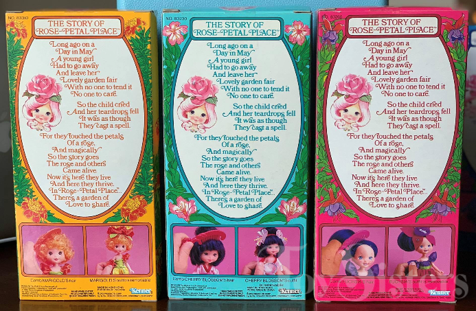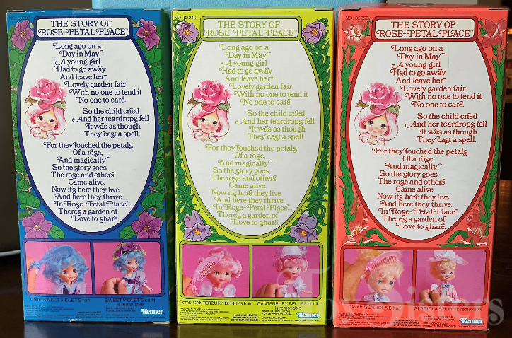 A beautiful second series of Rose Petal Place dolls was designed and produced in very limited (prototype) quantities. Like the first series, the dolls in this grouping would have been named after flowers and each come with a purse and comb. To see the other Rose Petal Place toys, click here.