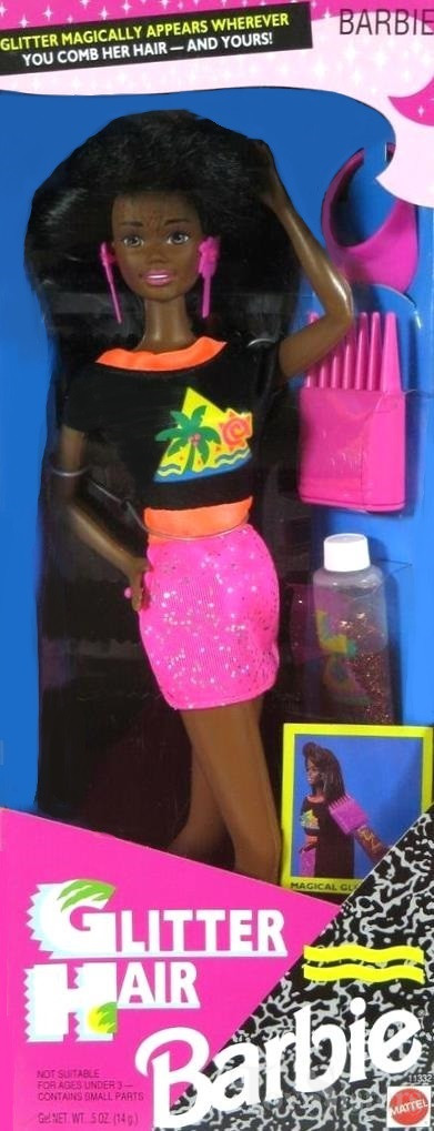 The Barbie Glitter Hair line was copyrighted in 1993 and released in 1994. Following the popularity of the Totally Hair line, these dolls all have long, ankle-length hair. They are also packaged with glittery gel, perfect to destroy said hair.