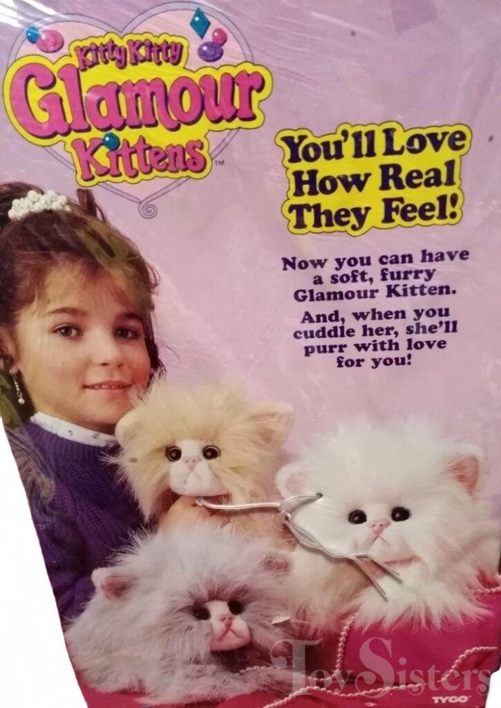 The Kitty Kitty Glamour Kittens were a series of three kittens made by Tyco. They are larger than the standard Kitty Kitten. They each wear a pink lace ribbon. To see other Tyco Kitty Kitten plush, click here.