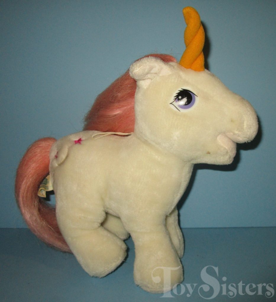 In 1985, Moondancer was released as a Hasbro Softie. She came with a purple shooting star brush. She has a closed-mouth and open-mouth version. To return to the Softie menu, click here. To return to the main G1 Pony menu, click here.