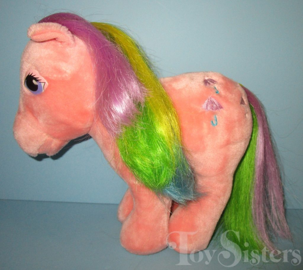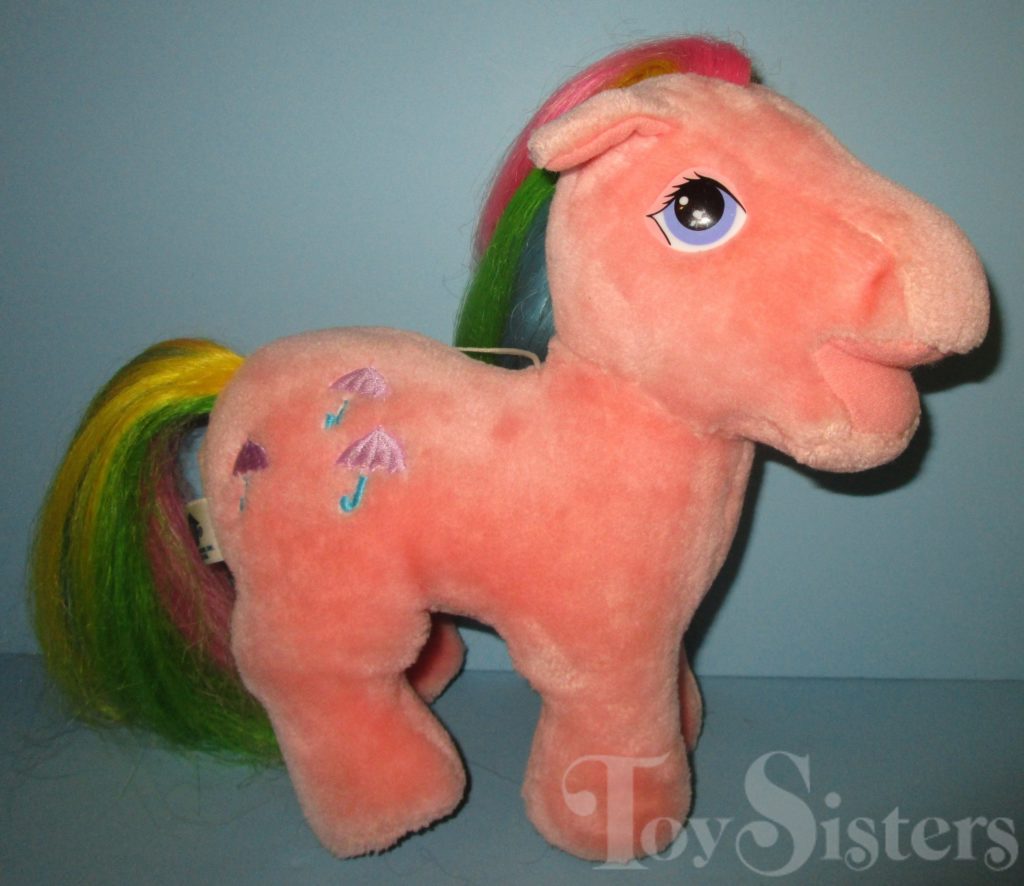 In 1985, Parasol was released as a Hasbro Softie. She came with a purple shooting star brush. She has an open-mouth and a closed-mouth version. To return to the Softie menu, click here. To return to the main G1 Pony menu, click here.