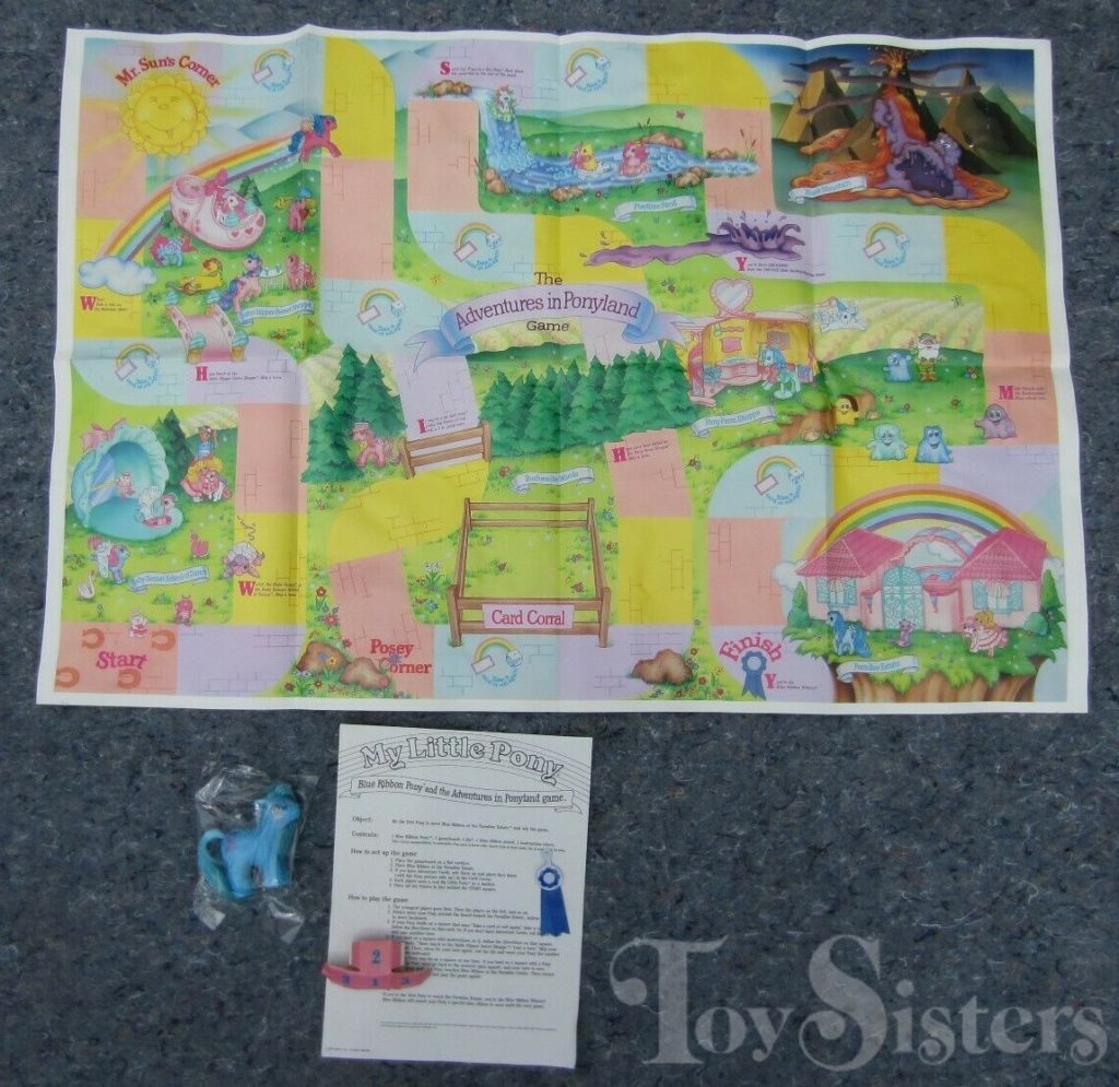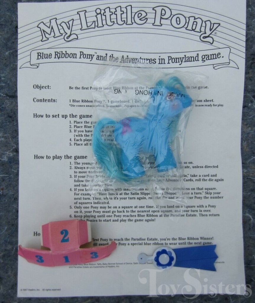 Baby Blue Ribbon was released in the Adventures in Ponyland Game in 1986-1987 and was only available through mail order. She is in the Baby Ember Pose. To view other ponies by year/series, click here.