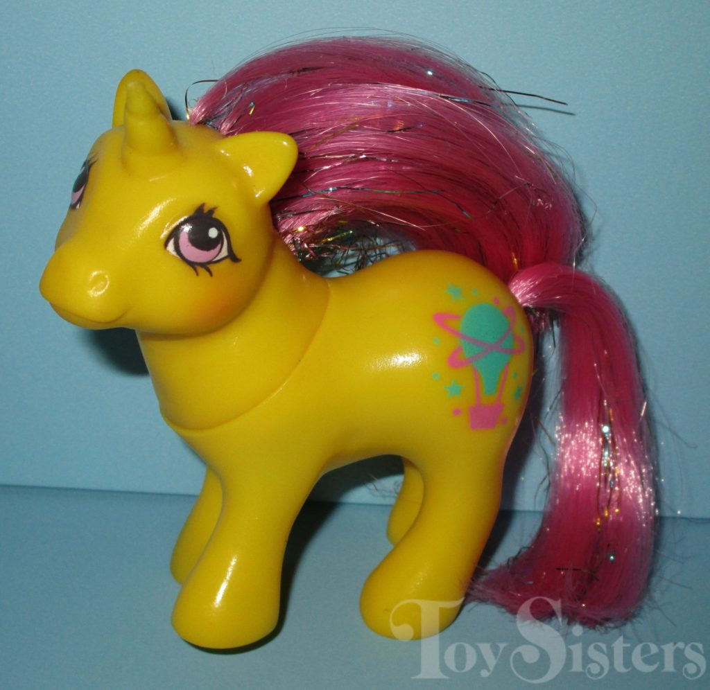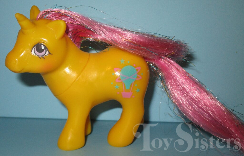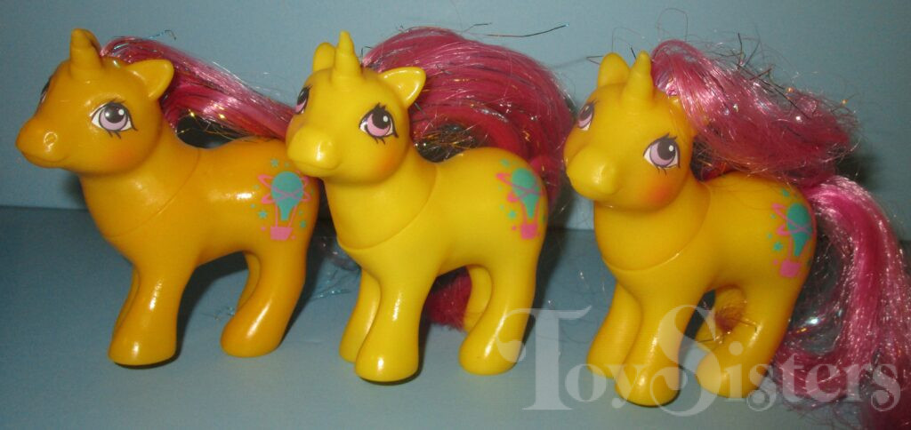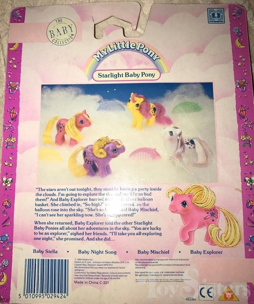 Baby Explorer was released in Europe and is a Starlight Baby.  She came with a pink star comb.  She has a “Made in China” and a “Made in Hong Kong” variation.  Her body color can vary greatly.  She is in the Baby Glory Pose.  To view other ponies by year/series, click here.