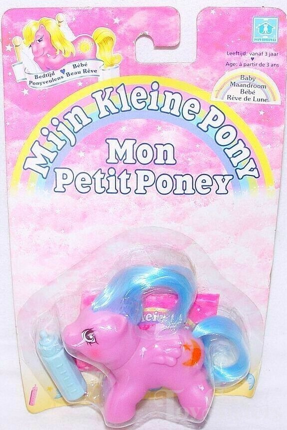 Baby Moondream was released in Europe and is a Bedtime Newborn. She came with a blue bottle. She is in the Newborn Yo-Yo Pose. To return to the main G1 My Little Pony menu, click here.