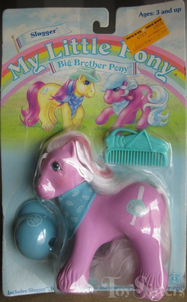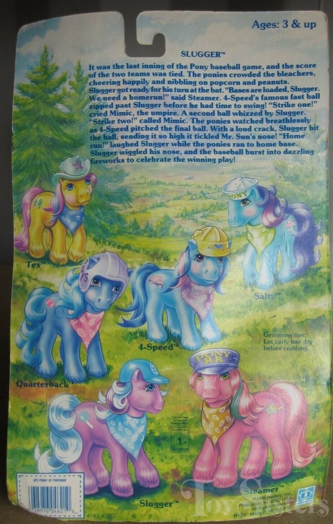 Slugger was released in 1987 and is a Big Brother Pony. He came with a hat, teal grasshopper comb, and teal bandanna. He is in the Steamer Pose. To view other ponies by year/series, click here.
