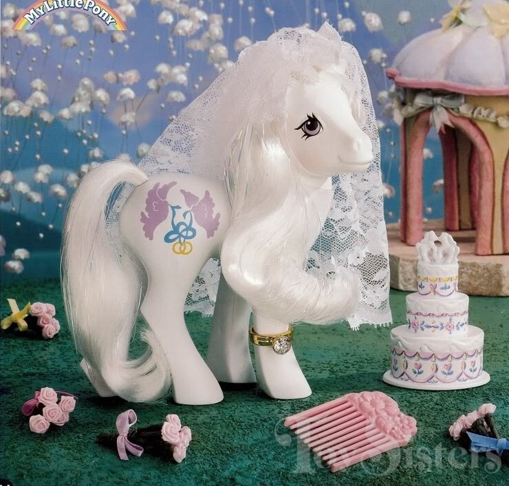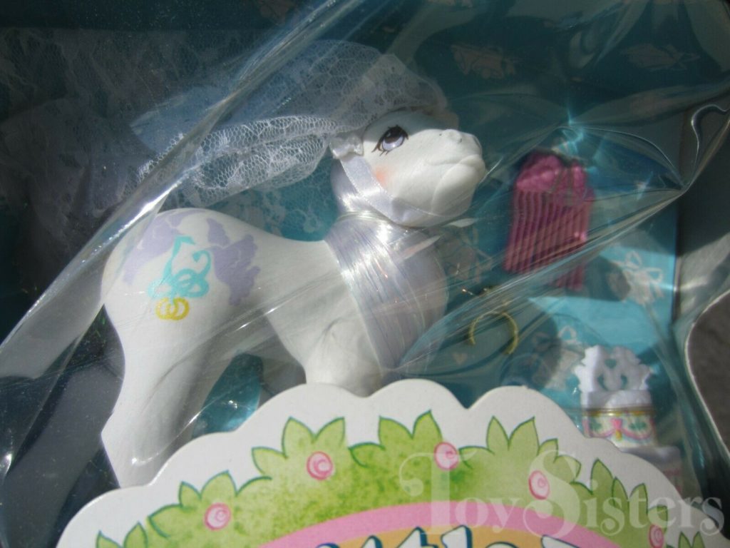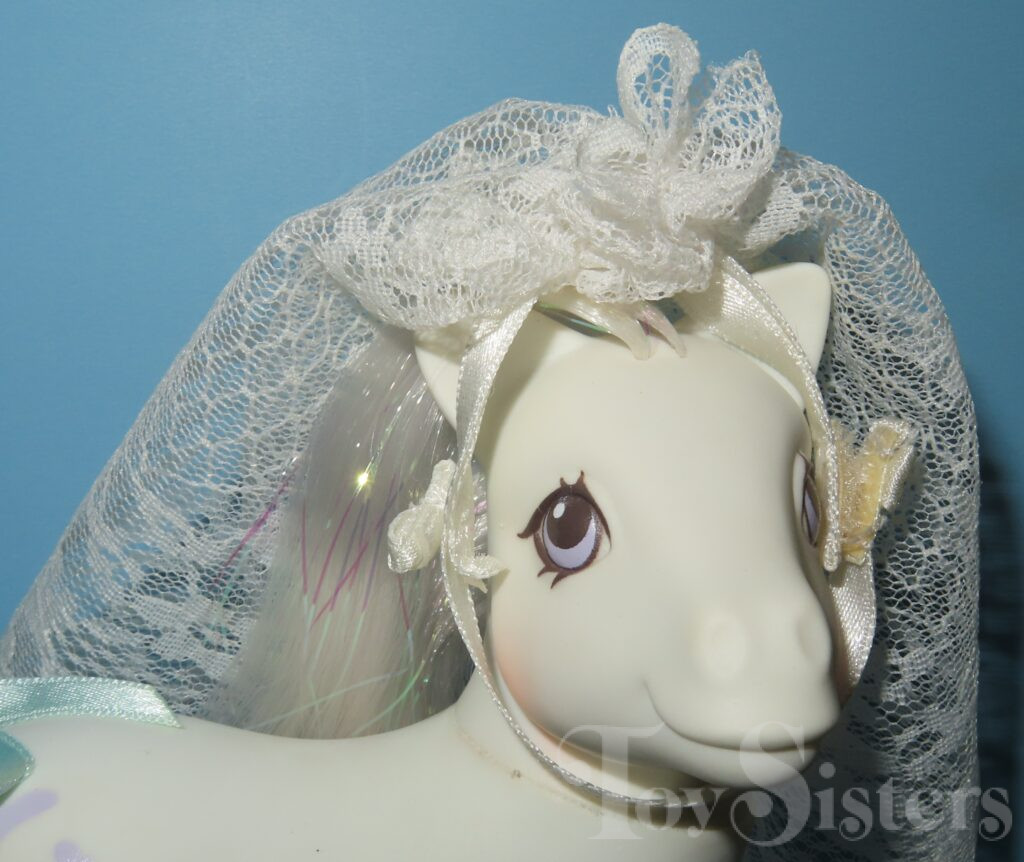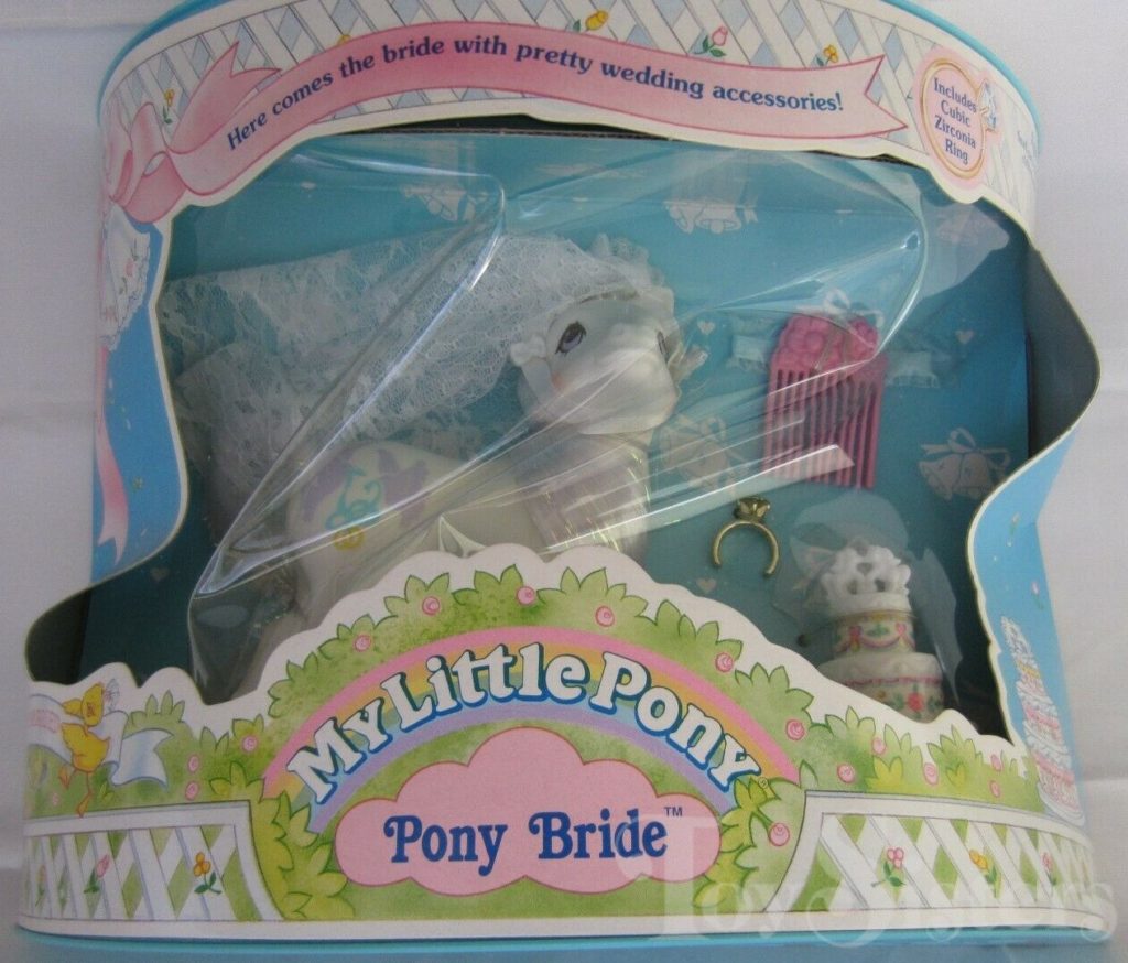 Pony Bride was released in 1990. She came with a veil, wedding cake, ring, and pink flower comb. She is in the Bride Pose. To view other ponies by year/series, click here.