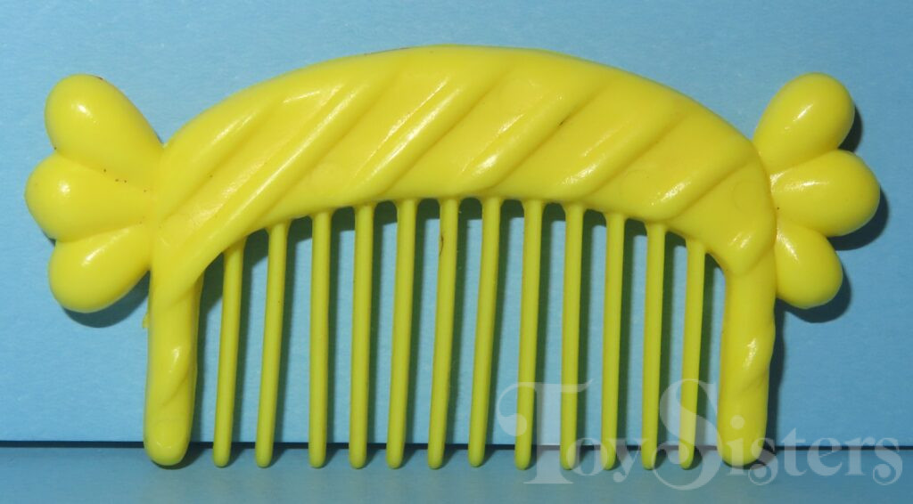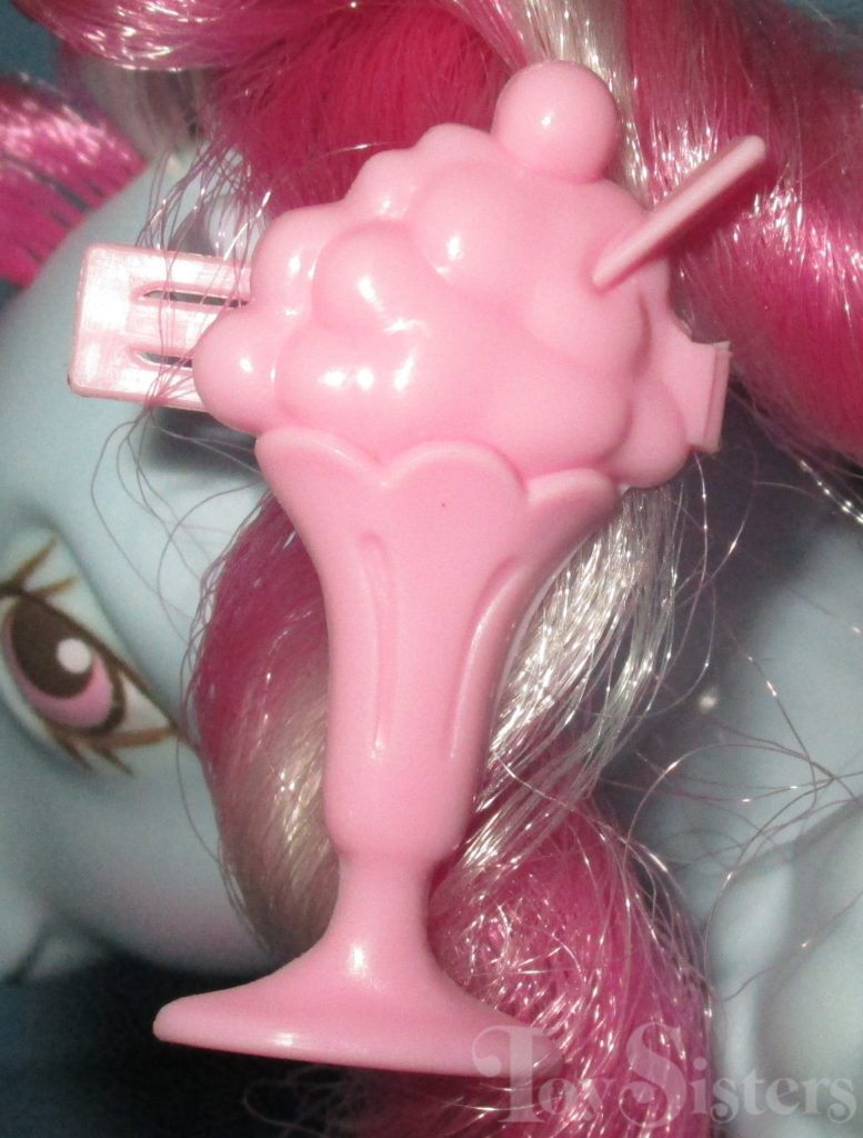 Sugar Apple was released in 1989 and is a Candy Cane Pony.  She came with a pink milkshake barrette, yellow candy brush, and pink ribbon.  She is in the Surprise Pose.  To view other ponies by year/series, click here.