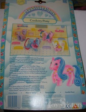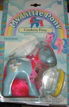 Cherry Sweet was released exclusively in Europe and is a Cookery Pony. She came with an apron, yellow comb, and blue ribbon. She is in the Tootsie Pose. To view other ponies by year/series, click here.