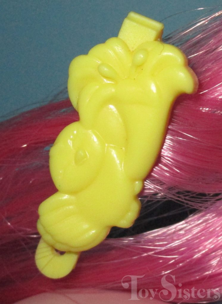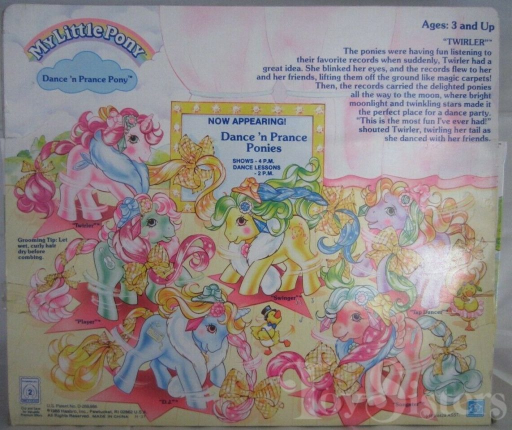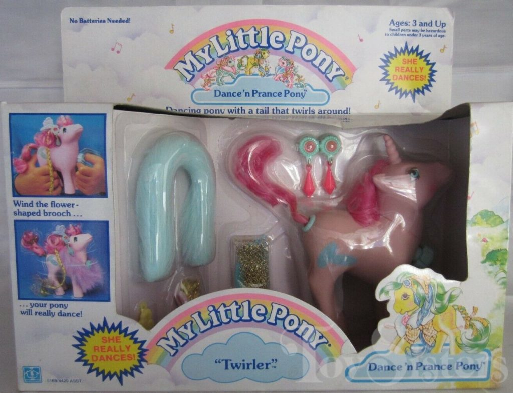 Twirler was released in 1989 and is a Dance ‘n Prance Pony. She came with a teal boa, mint and pink earrings, a purple clip with yellow hair, a yellow bird and lily barrette, a gold mesh ribbon, and a blue star comb. She is in the Powder Pose. To view other ponies by year/series, click here.