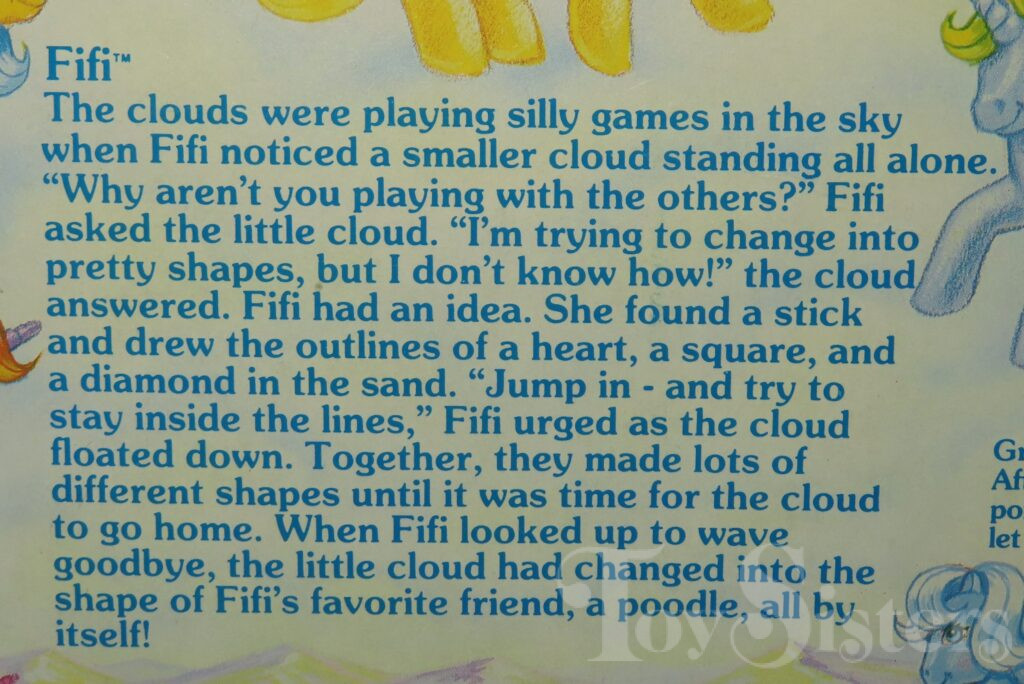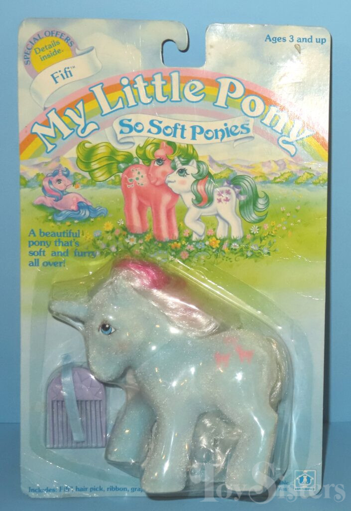 Fifi was released in 1985 and is a So Soft Pony. She came with a blue ribbon and purple sunshine comb. She is in the Buttons Pose. To view other ponies by year/series, click here.