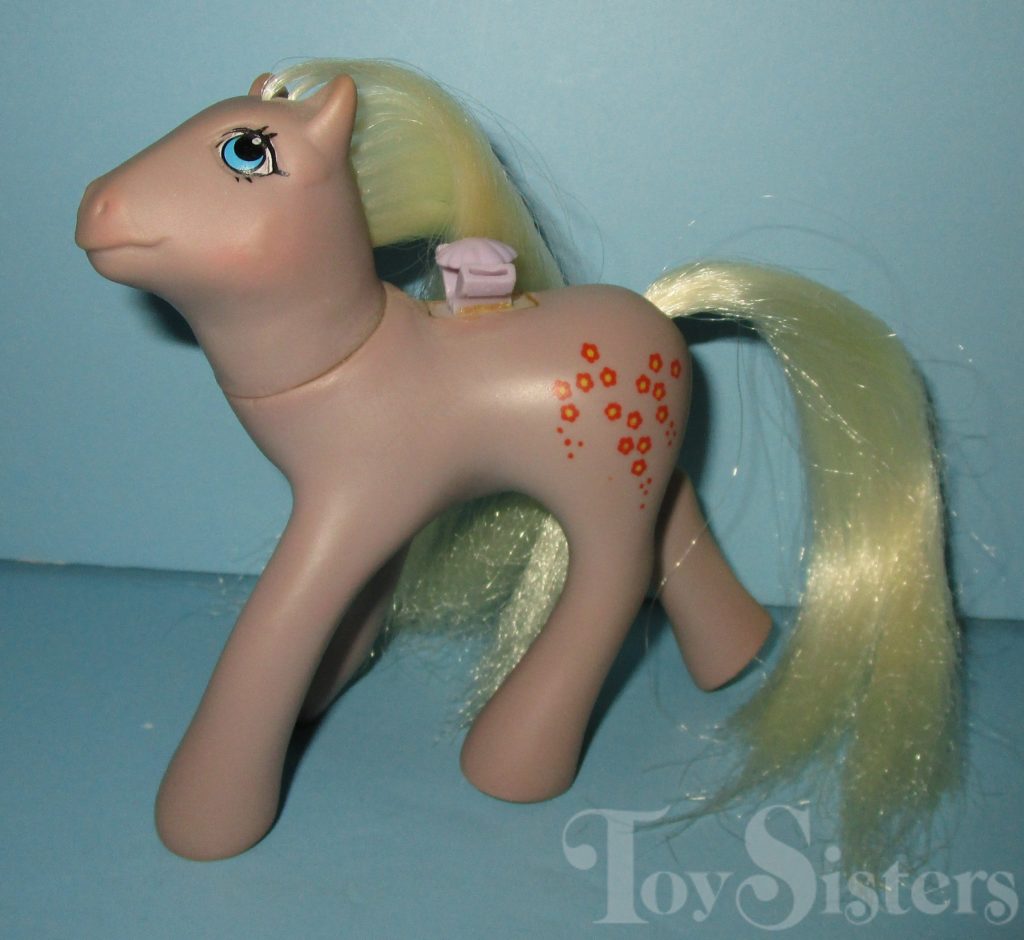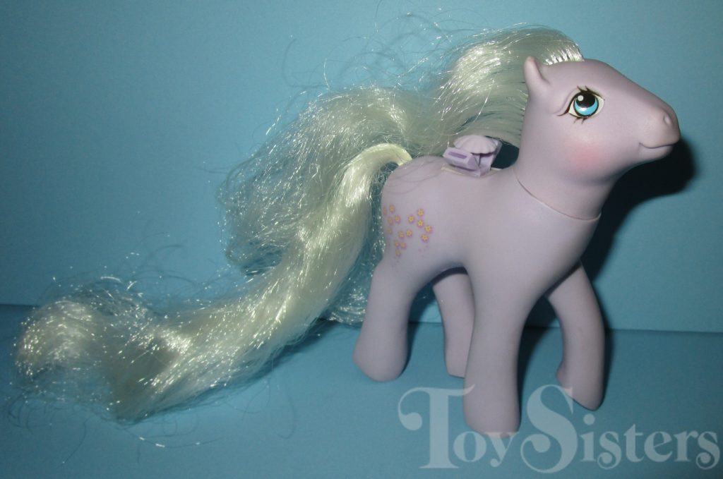 Forget-Me-Not was released in 1986 and is a Flutter Pony. She has a small and large head variation. Flutter Ponies came with wings, but usually these have broken off the pony and been lost. She also came with a pink flower pick and silver ribbon. She is in the Peach Blossom Pose. To view other ponies by year/series, click here.