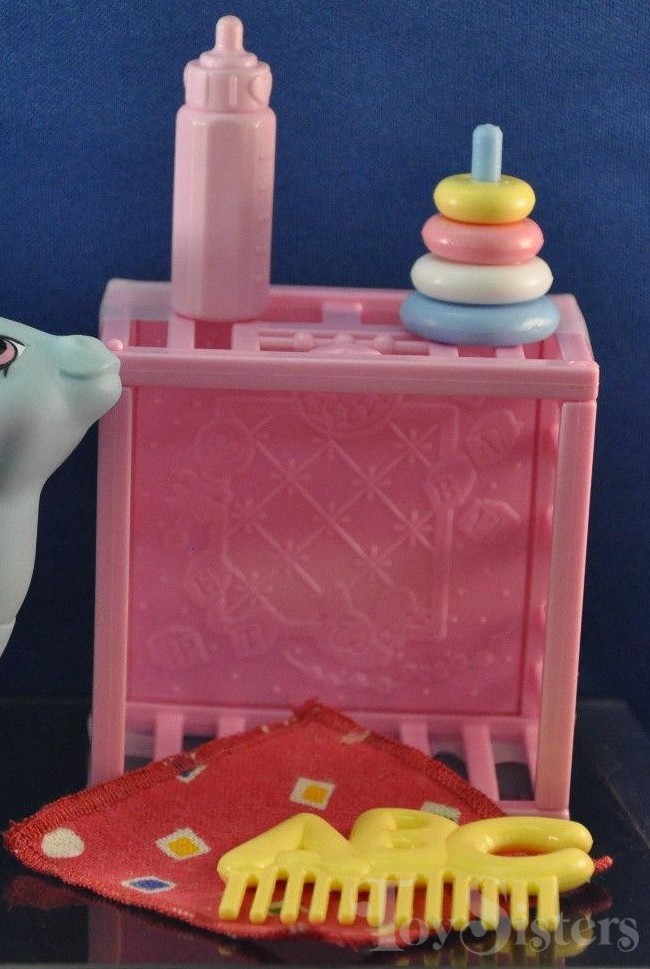 Baby Wurfelchen was released in Germany and is a Nesthackchen Baby.  She came with a pink playpen, a red blanket, stacking toy, yellow ABC comb, and pink ribbon.  She is in the Baby Blossom Pose.  To view other ponies by year/series, click here.