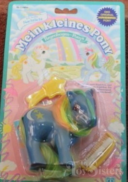 Night Light was released in Germany and is a Rainbow Pony. She came with a yellow star comb, yellow comb, and ribbon. She has large and small symbol variation. She is also called Nachtlicht. She is in the Sundance Pose. To view other ponies by year/series, click here.