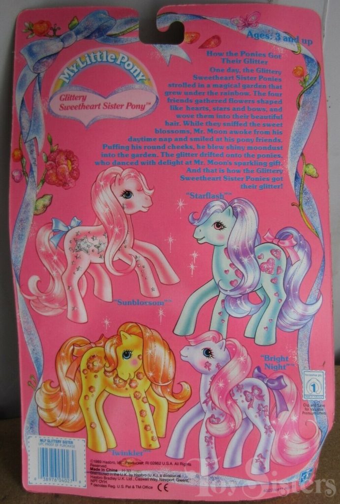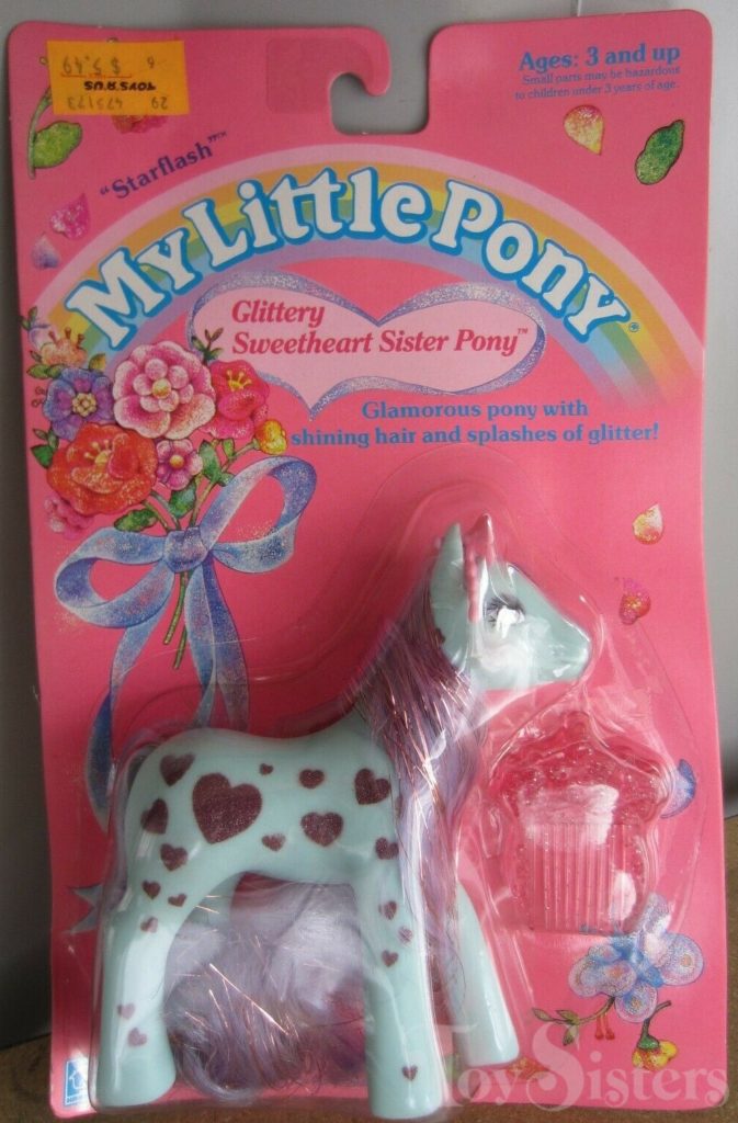 Starflash was released in 1990 and is a Glittery Sweetheart Sister Pony. She came with a star comb. She is in the Fancy Flower Pose. To view other ponies by year/series, click here.