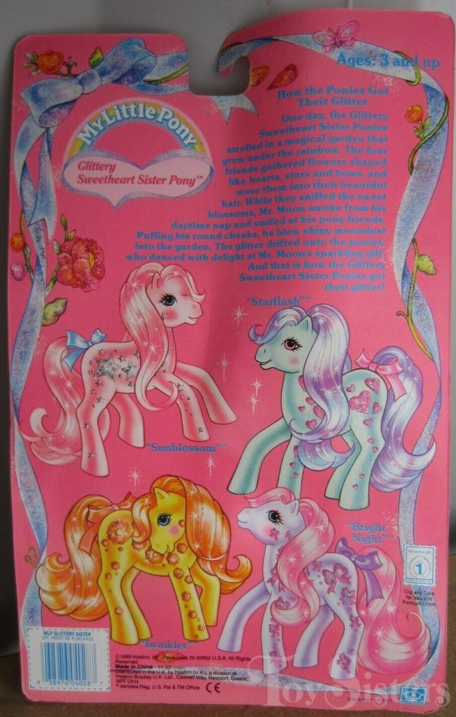 Sunblossom was released in 1980 and is a Glittery Sweetheart Sister Pony.. She came with a blue star comb. She is in the Fancy Flower Pose. To view other ponies by year/series, click here.