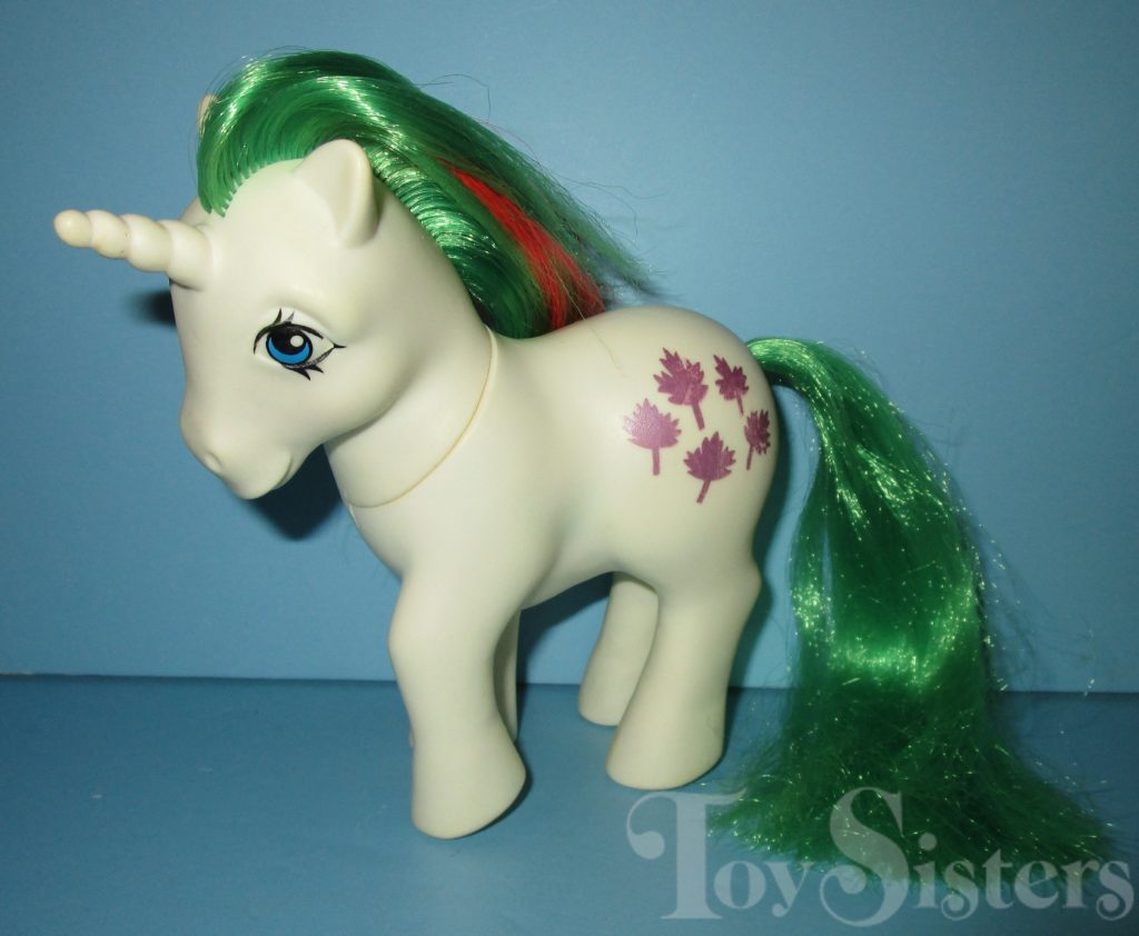 Gusty was first released in 1984 and is a Unicorn Pony.  She came with a pink moon comb and ribbon.   In Europe, Gusty’s symbol was not glittery and she has green eyes.  In 1985-1986, Gusty was released again as a So Soft pony.  She is in the Gusty Pose.   To view other ponies by year/series, click here.