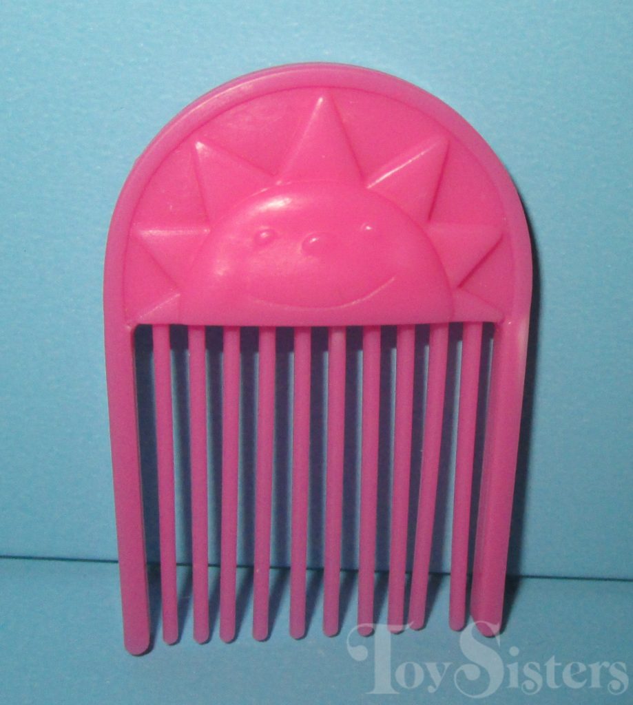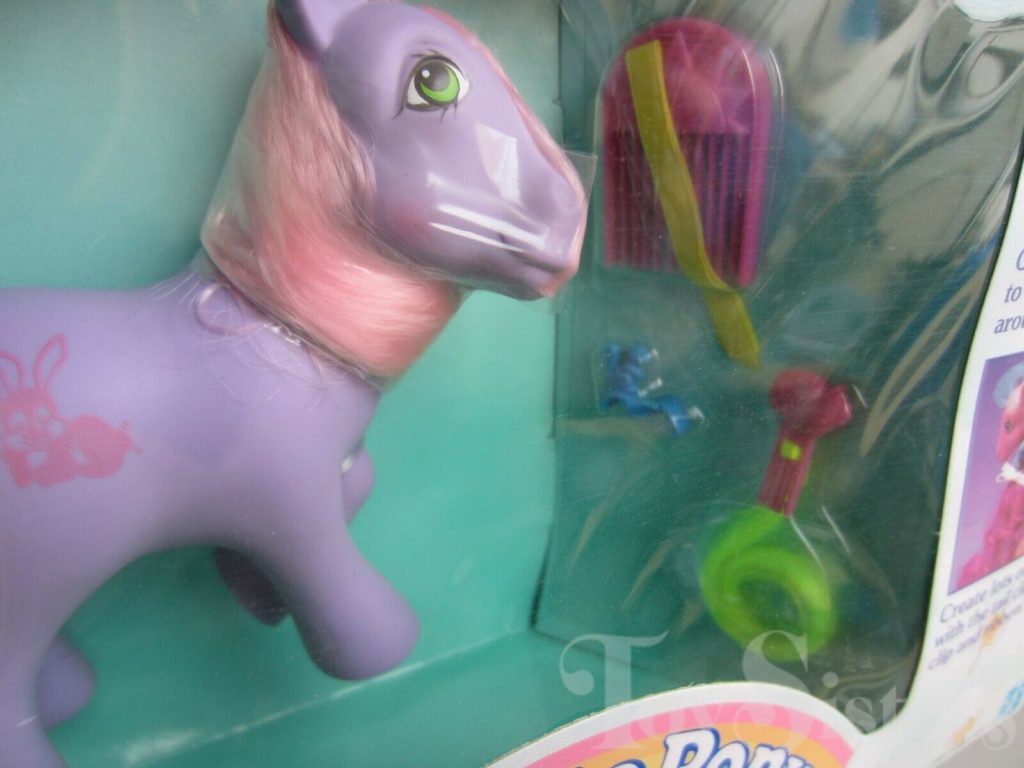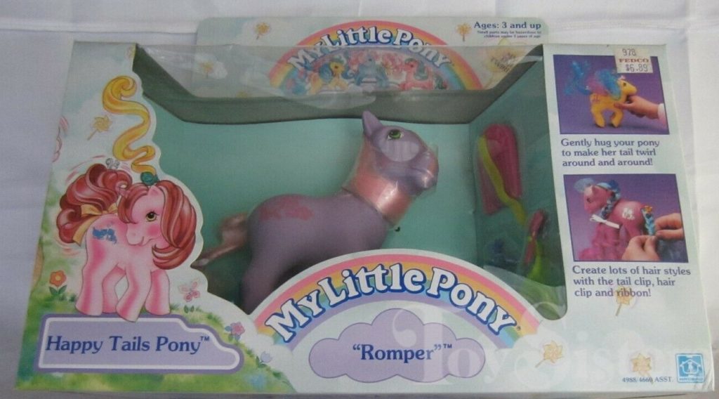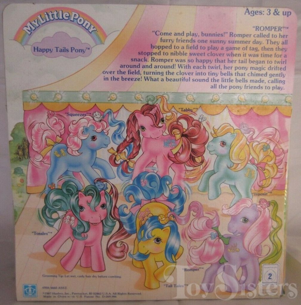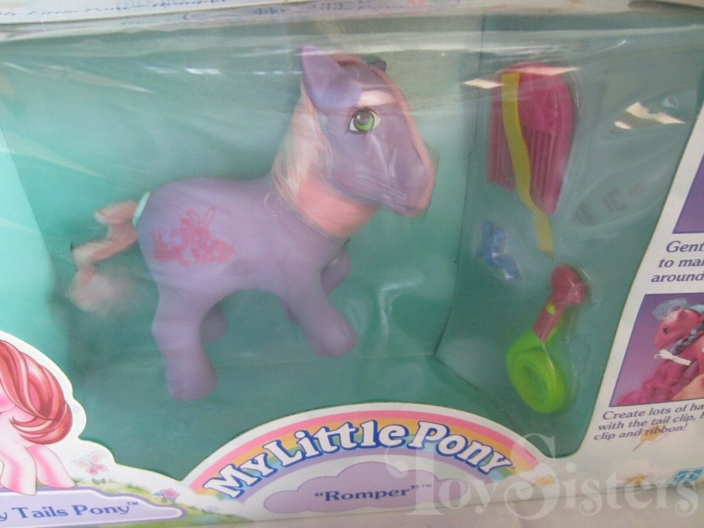 Romper was released in 1988 and is a Happy Tails Pony. She came with a pink sun comb, a pink bird pick with neon yellow hair, a blue squirrel ring, and a neon yellow ribbon. In Europe, variations of Romper can be found with no tail mechanism, and sometimes also missing a symbol. She is in the Tootsie Pose. To view other ponies by year/series, click here.