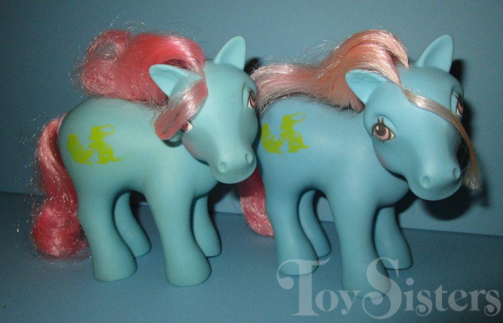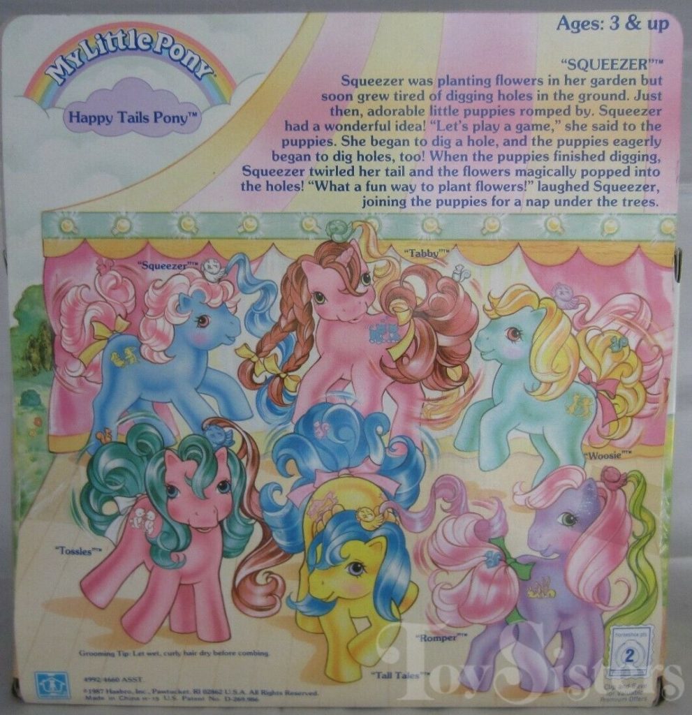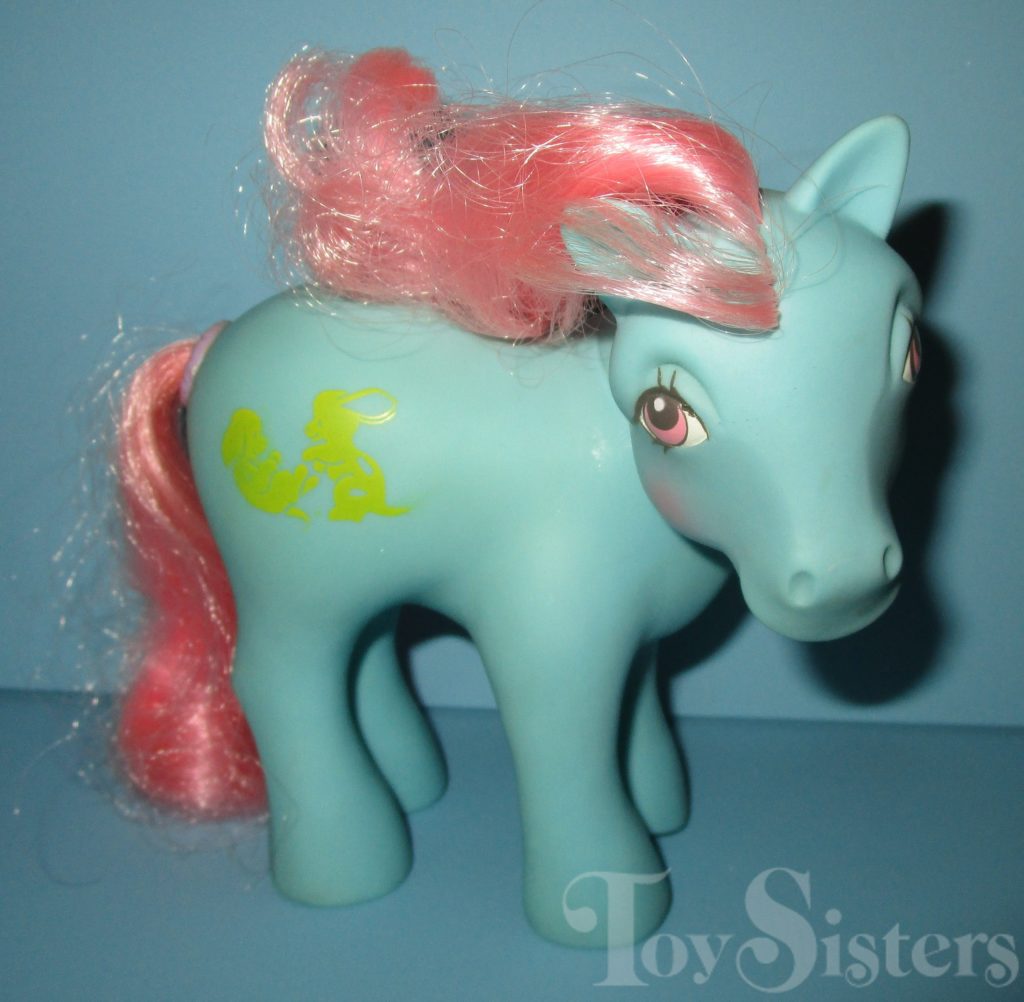Squeezer was released in 1988 and is a Happy Tails Pony. I have seen variations in her body color. She came with a blue duck comb, a white bird pick with blue hair, a pink squirrel ring, and a yellow ribbon. In the UK, variations of Squeezer can be found with no tail mechanism, or with a blue tail, and sometimes missing a symbol. She is in the Sundance Pose. To view other ponies by year/series, click here.