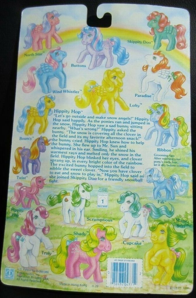 Hippity Hop was released in 1985 and is a So Soft Pony. She came with a light pink ribbon and purple bird brush. She is in the Lofty Pose. To view other ponies by year/series, click here.