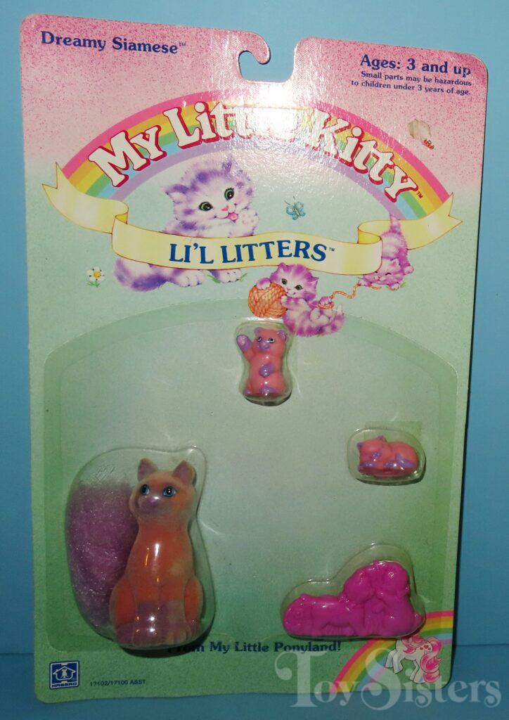The Dreamy Siamese Li’l Litters My Little Kitty set came with a mom and two baby kittens. It also came with a kitty brush. To return to the Li’l Litters menu, click here. To return to the main G1 Pony menu, click here.