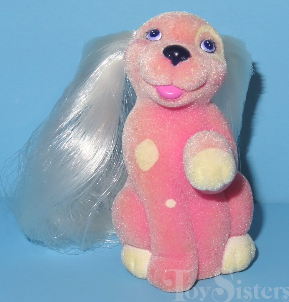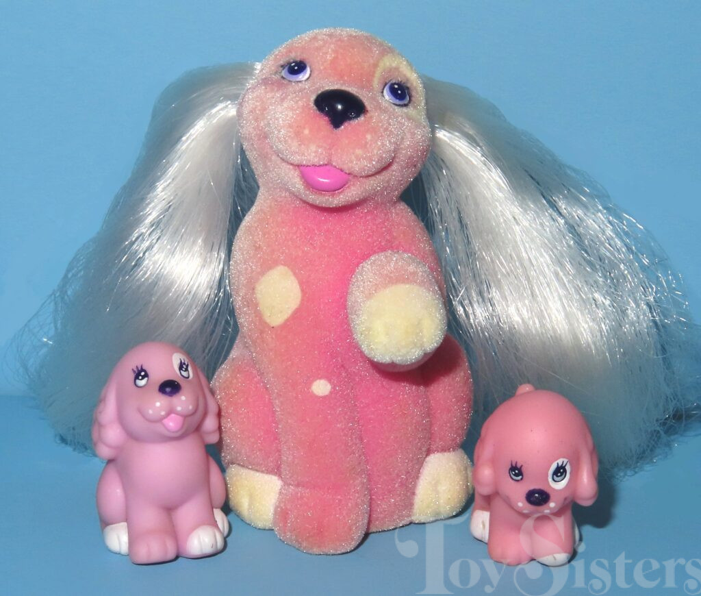 The Scrub-A-Dub Spaniels Li’l Litters My Little Puppy set came with a mom and two baby puppies. It also came with a white tub, white soap, teal scrub brush, and purple duck comb. To return to the Li’l Litters menu, click here. To return to the main G1 Pony menu, click here.