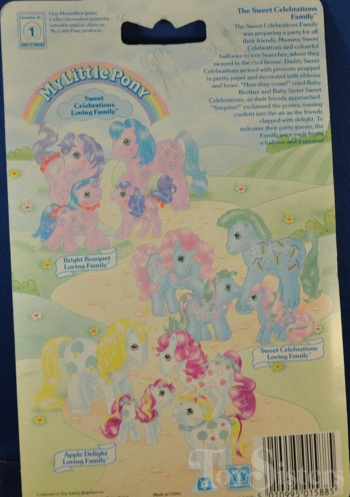 Baby Sweet Celebrations was released in 1989 in European countries. She is a Loving Family Pony. She was released as a single and also with Mommy Sweet Celebrations, Daddy Sweet Celebrations and Baby Brother Sweet Celebrations. She is in the Baby Ember Pose. To view other ponies by year/series, click here.