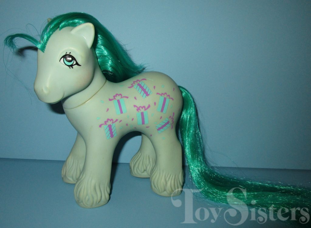 Daddy Sweet Celebrations was released in 1989 and is a Loving Family Pony. He was released with Mommy Sweet Celebrations and Baby Brother Sweet Celebrations. He came with a pink flower brush and teal flower comb. In Europe, he was also released with Baby Sweet Celebrations. He was either made in China or made in Hong Kong. His U.S. release was primarily made in Hong Kong. He is in the Steamer Pose. To view other ponies by year/series, click here.