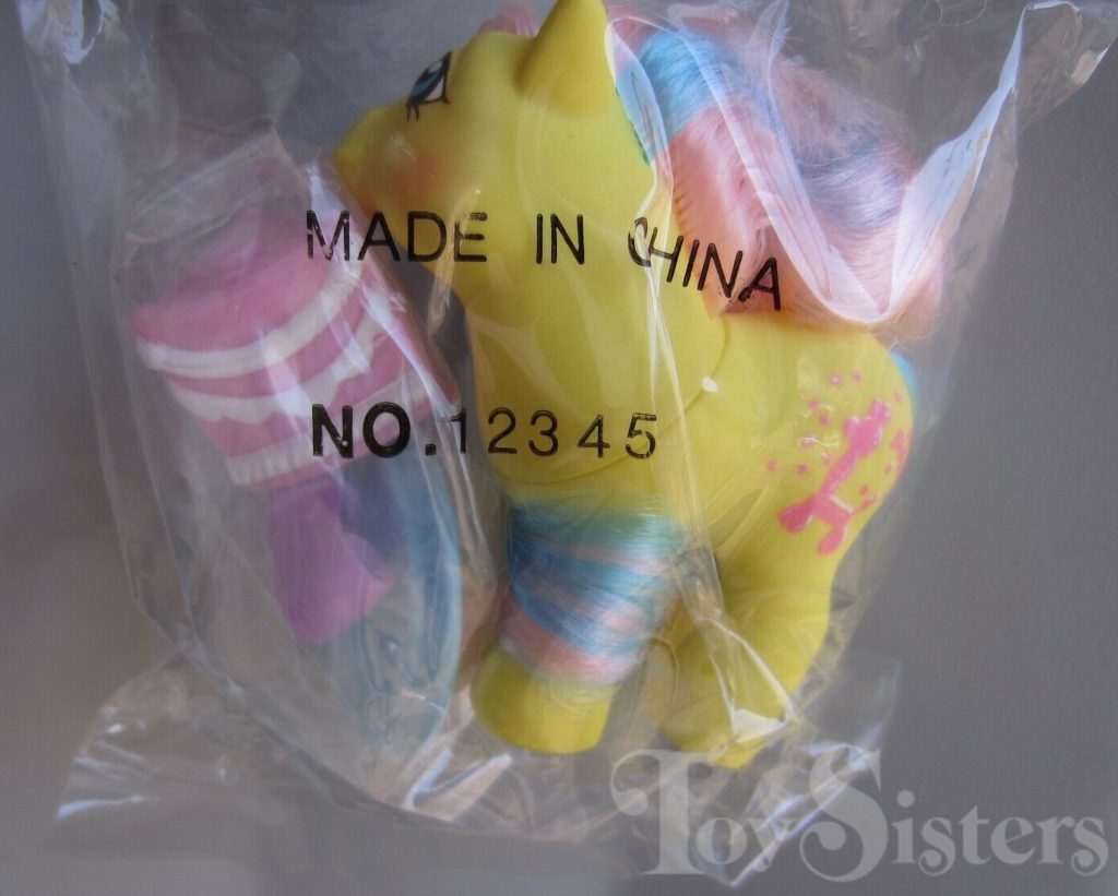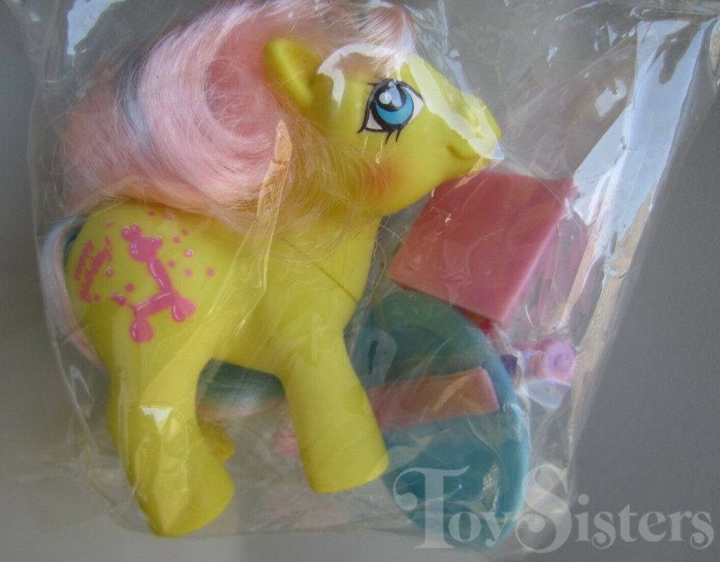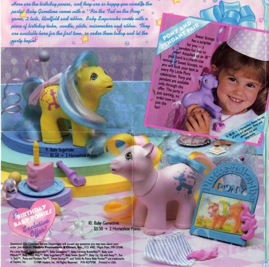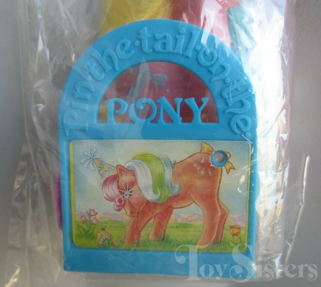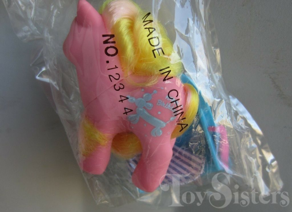 The Baby Birthday Ponies are two ponies that were released via mail order in 1989-1990. Baby Gametime came with a pin the tail game, two tails for the game, a blindfold, and a blue ribbon. Baby Sugarcake came with a piece of pink cake, yellow candle, purple noisemaker, blue dish, and pink ribbon. They are both in the Baby Ember Pose. To view other ponies by year/series, click here.