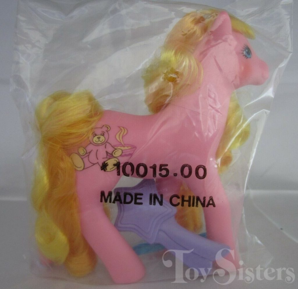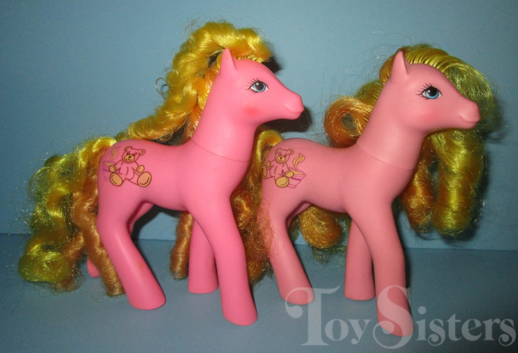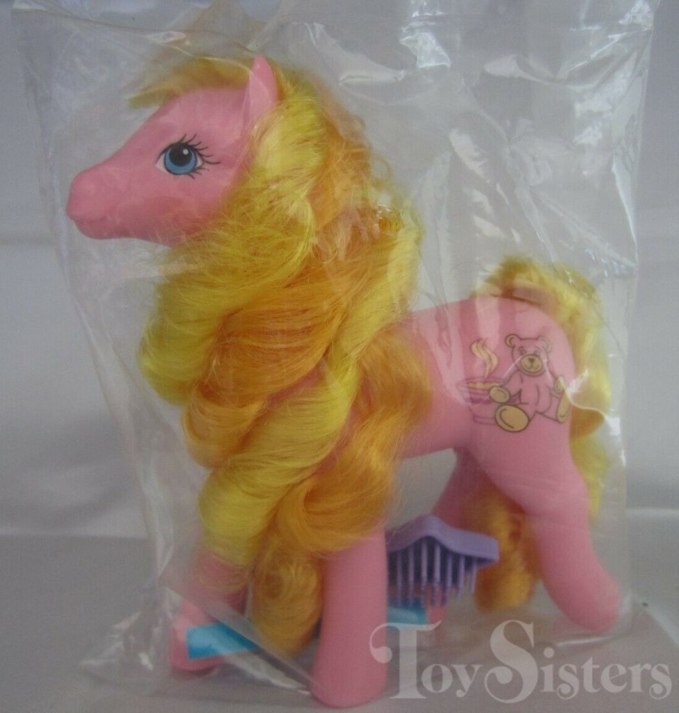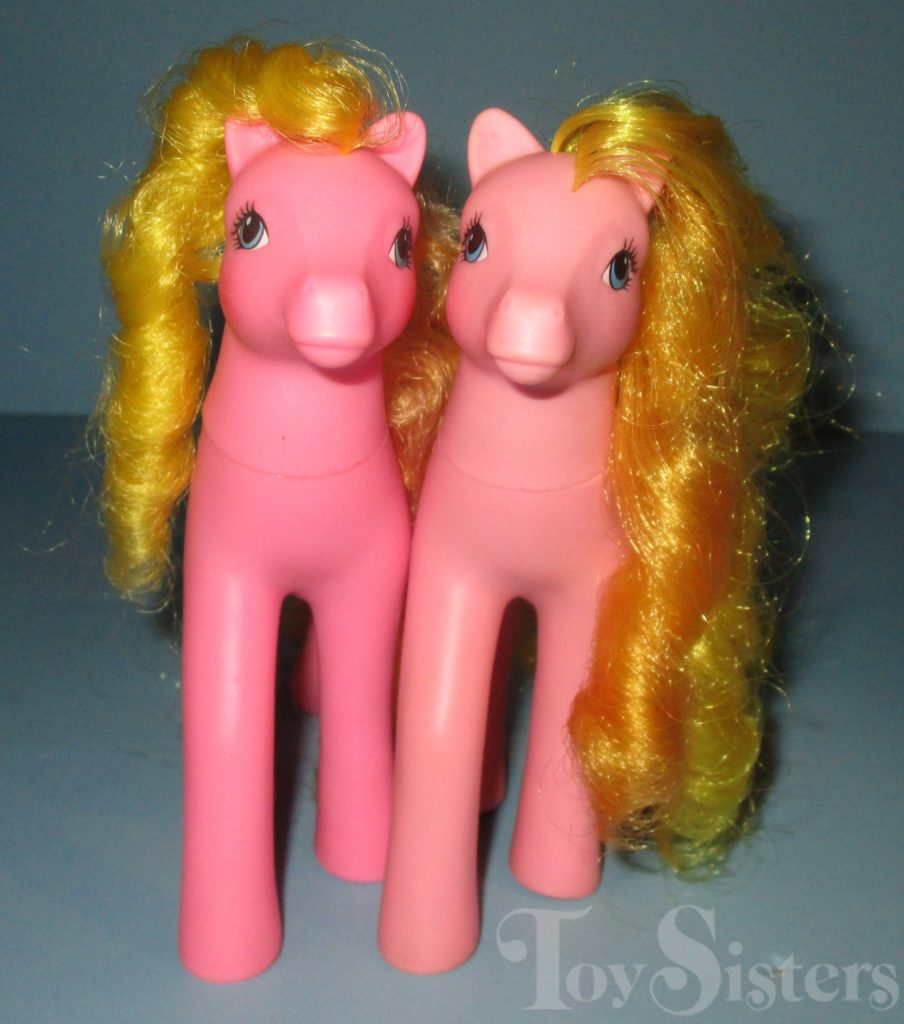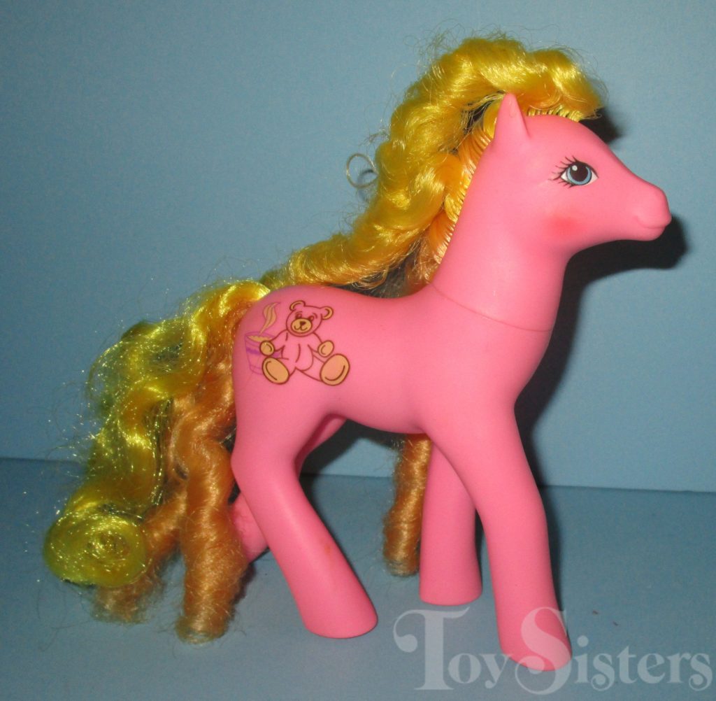 Goldilocks was released via mail order in 1989-1990. She came with a blue ribbon and purple star brush. She has a variation with a darker body and reversed symbol on one side. She’s the hoof you see in a thrift store box (covered by a bit of golden hair) and hope you’ve found Rapunzel. Goldilocks: the beautiful sweetheart sister mold “not the Rapunzel” of the pony world. As far as mail order ponies go, she is rather easy to find (though in my experience, the light version is more common). She is in the Dainty Pose. To view other ponies by year/series, click here.