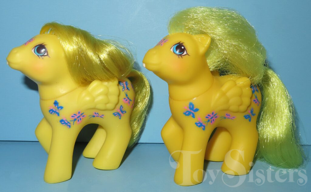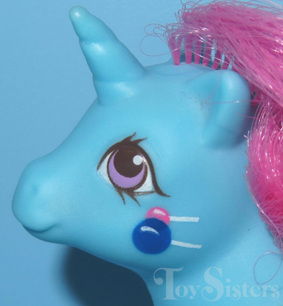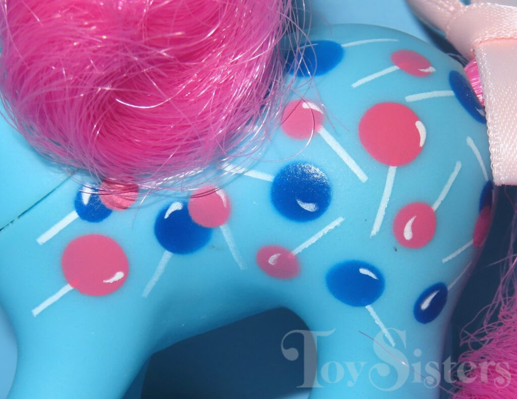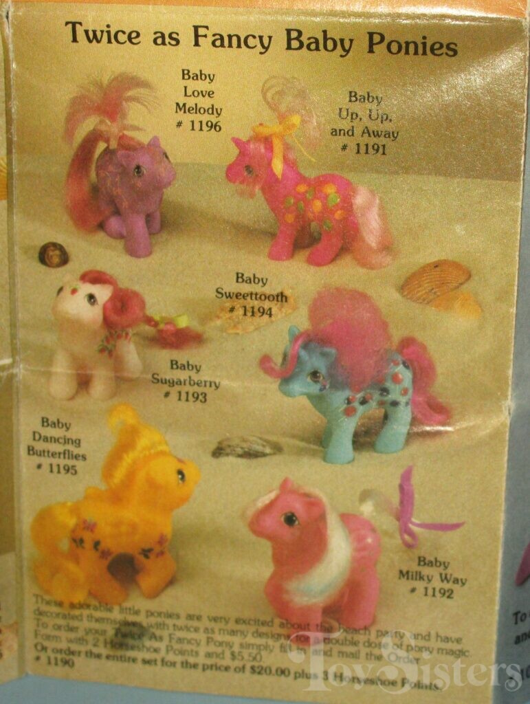 In 1989-1990, baby versions of the Year 5 Twice as Fancy Ponies were released via mail order. They all came with a ribbon, and each of them has both a “Made in China” and “Made in Hong Kong” version. Baby Sugarberry and Baby Love Melody are in the Baby Fifi Pose. Baby Dancing Butterflies and Baby Milky Way are in the Baby Bouncy Pose. Baby Up, Up, and Away and Baby Sweet Tooth are in the Baby Glory Pose. To view other ponies by year/series, click here.