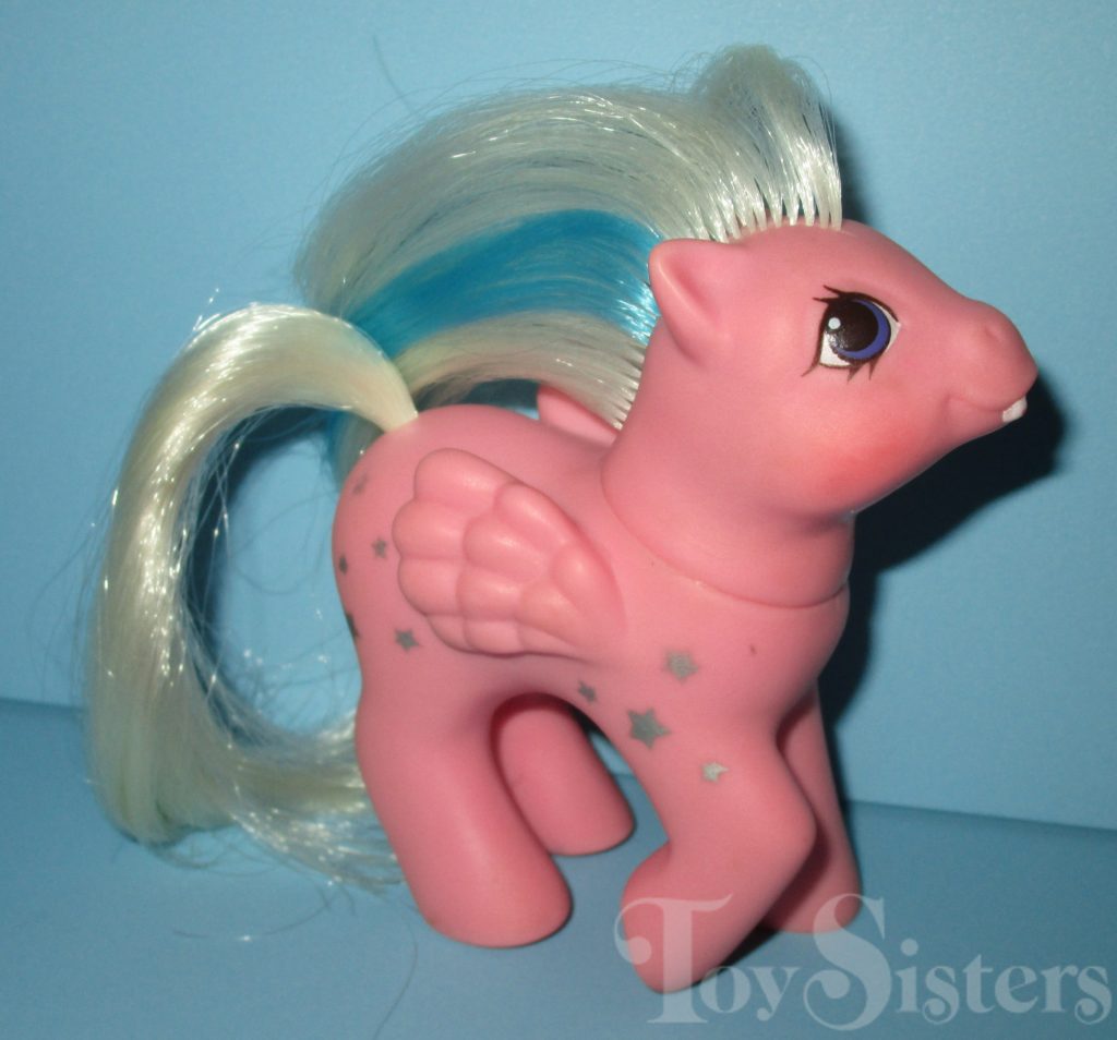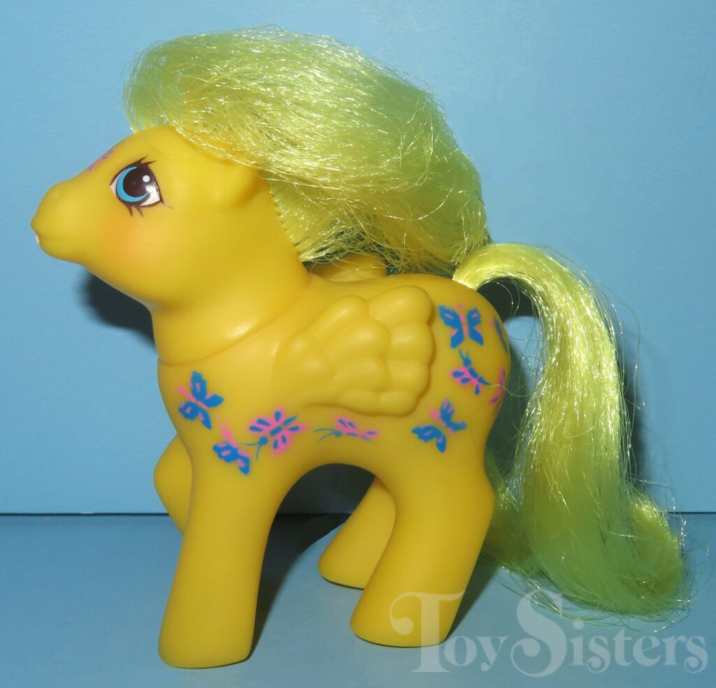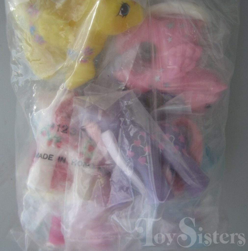In 1989-1990, baby versions of the Year 5 Twice as Fancy Ponies were released via mail order. They all came with a ribbon, and each of them has both a “Made in China” and “Made in Hong Kong” version. Baby Sugarberry and Baby Love Melody are in the Baby Fifi Pose. Baby Dancing Butterflies and Baby Milky Way are in the Baby Bouncy Pose. Baby Up, Up, and Away and Baby Sweet Tooth are in the Baby Glory Pose. To view other ponies by year/series, click here.