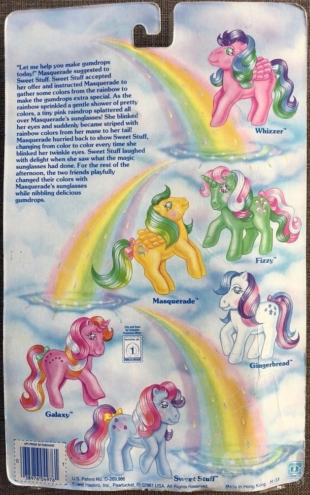 Masquerade was released in 1986 and is a Twinkle-Eyed Pony. She came with a pink ribbon and pink shooting star comb. She is in the Lofty Pose. To view other ponies by year/series, click here.