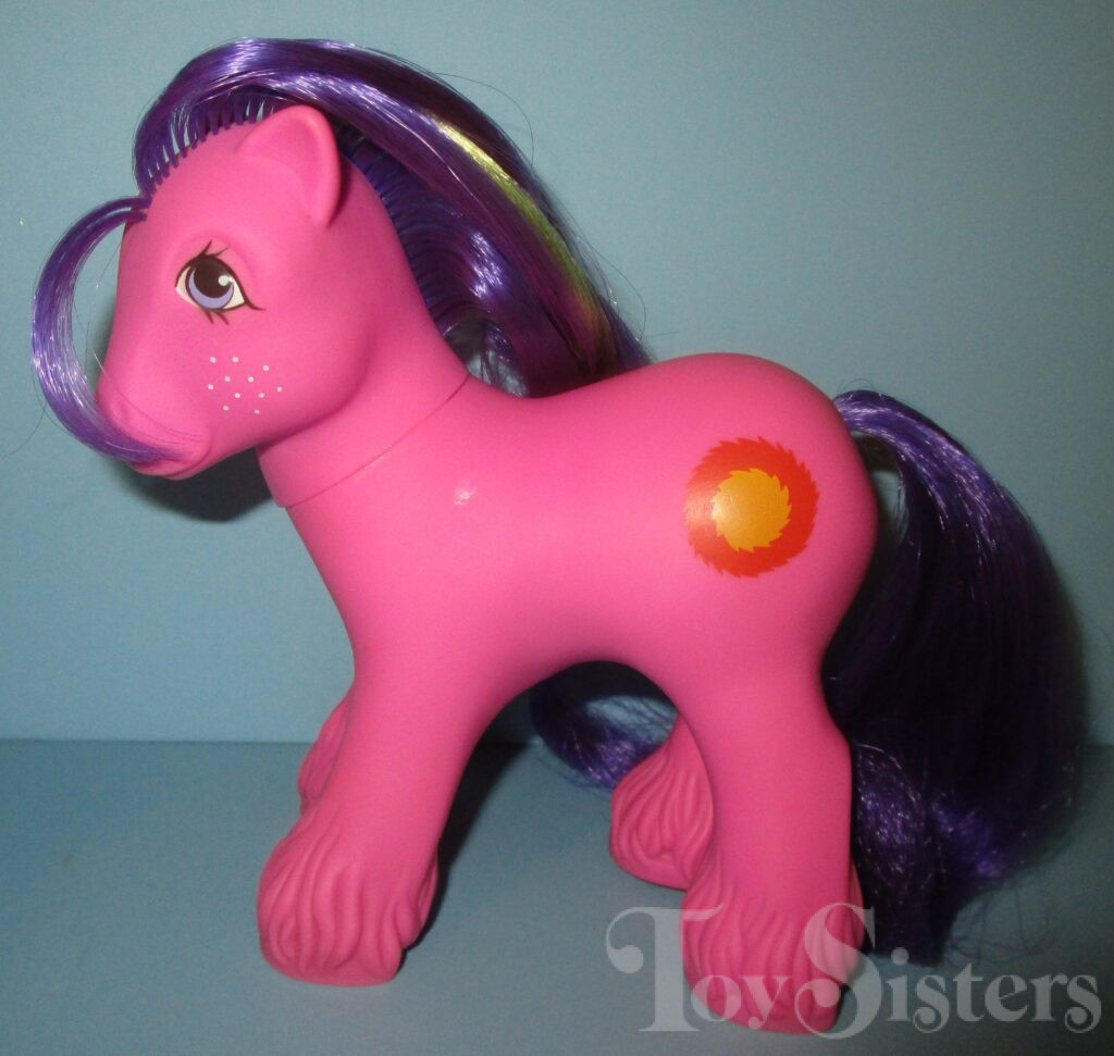 Mountain Boy Fireball was released in Europe and is a Mountain Boy Pony. He came with a purple frog comb and ribbon. Most Fireballs are made in Hong Kong but a rare “Made in Thailand” variation exists. He is in the Steamer Pose. To view other ponies by year/series, click here.