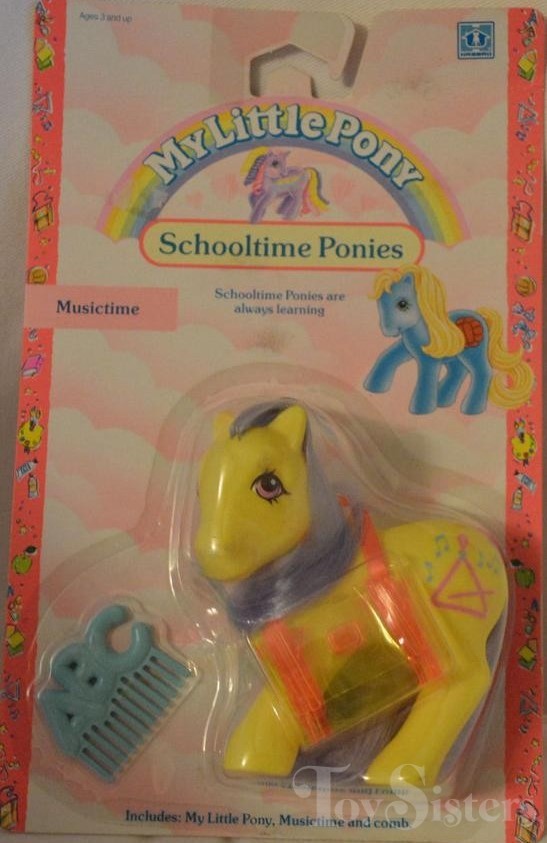 Music-Time was released in Europe and is a Schooltime Pony. She came with a teal ABC comb and yellow bag. She is in the Crumpet Pose. To view other ponies by year/series, click here.
