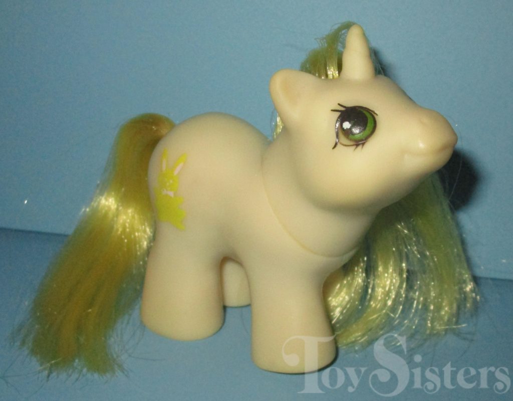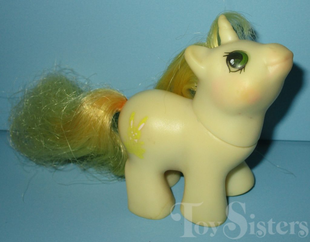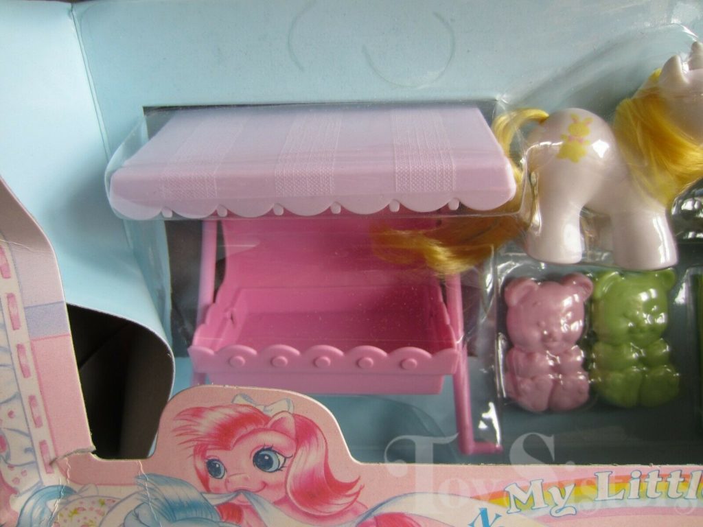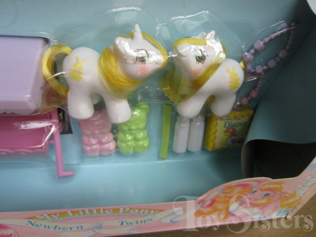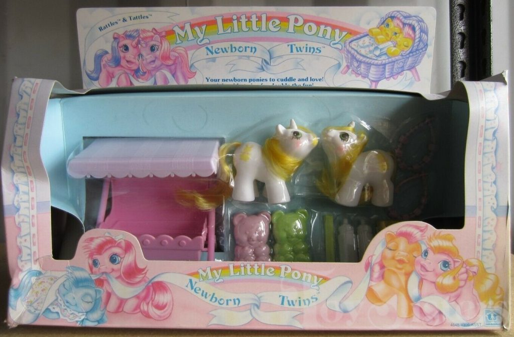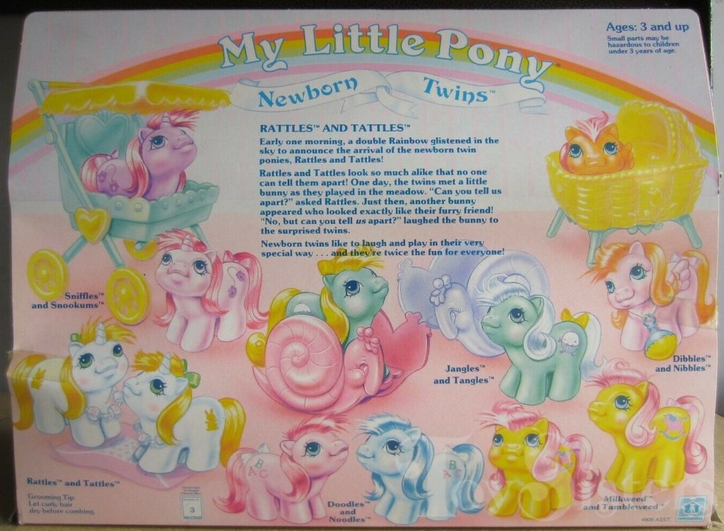 Rattles & Tattles were released in 1987 and are Newborn Twins. They came with a pink and purple stroller, a light pink necklace, a purple necklace, a light pink bear comb, a light green bear comb, two white bottles, two white diapers, a diaper box, and two yellow ribbons. Tattles is in the Newborn Sandcastle Pose. Rattles is in the Newborn Wiggles Pose. To return to the main G1 My Little Pony menu, click here.