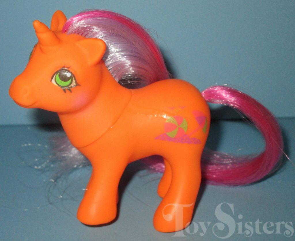 Baby Beach Ball was released in 1992 and is a Paradise Baby. She came with a blue flower brush. She is in the Baby Glory Pose. To view other ponies by year/series, click here.