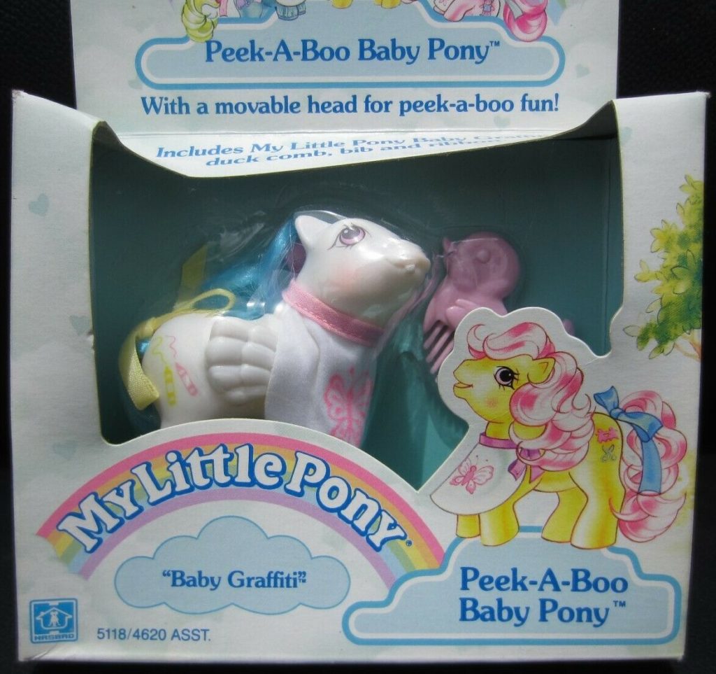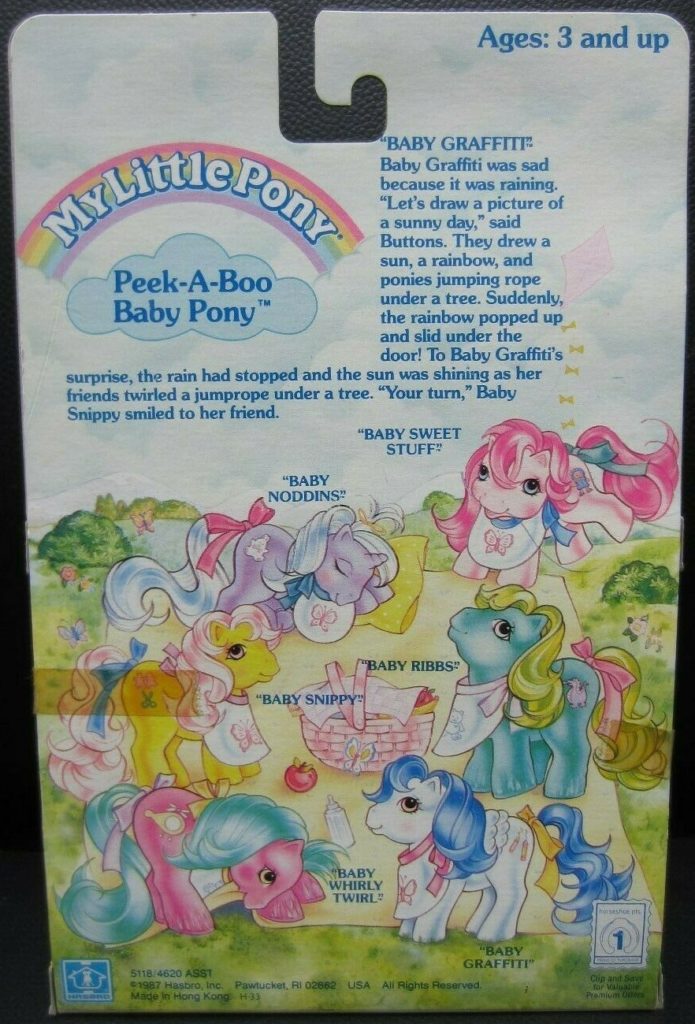 Baby Graffiti was released in 1988 and is a Peek-a-Boo Baby. She came with a pink trimmed butterfly bib, purple duck comb, and yellow ribbon. She is a white pony, but she frequently changes to a gray color. She is in the Baby Bouncy Pose but she is modified to have a head that nods. To view other ponies by year/series, click here.