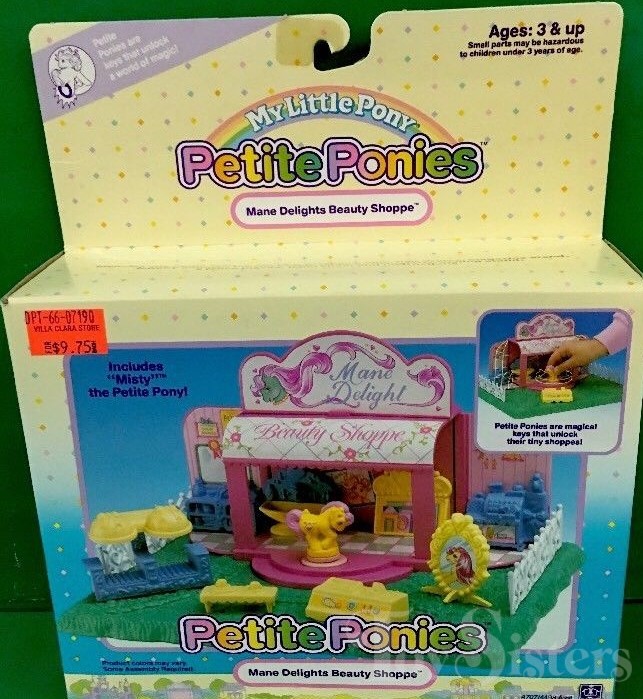 The Mane Delights Beauty Shoppe with Misty was released from 1989-1990. In Europe and Canada, Misty came in a different pose with a brushable tail. To return to the Playset Ponies, click here. To return to the Petite Pony menu, click here.