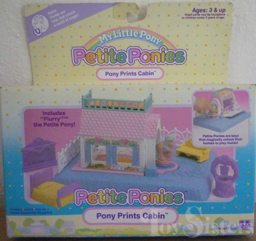 The Pony Prints Cabin with Flurry was released from 1989-1990. In Europe and Canada, Flurry came in a different pose with a brushable tail. To return to the Playset Ponies, click here. To return to the Petite Pony menu, click here.