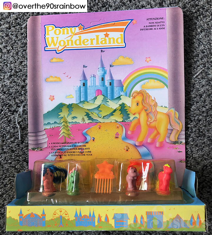 In Europe, a company named Globo produced fakie My Little Pony stampers using the Petite Pony molds. The line was called Pony Wonderland. They created 32 different ponies. Thank you to overthe90srainbow for most of these pictures and for sharing her knowledge about the line.