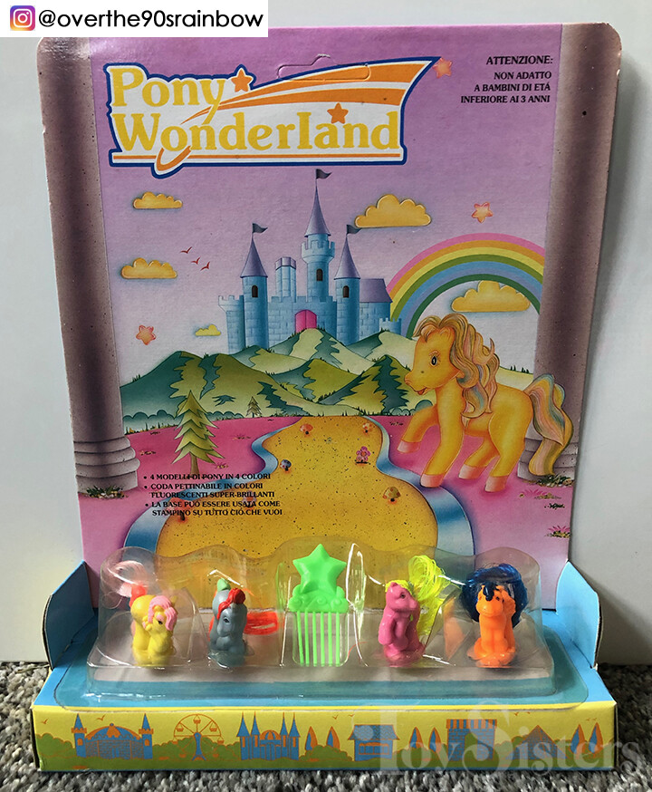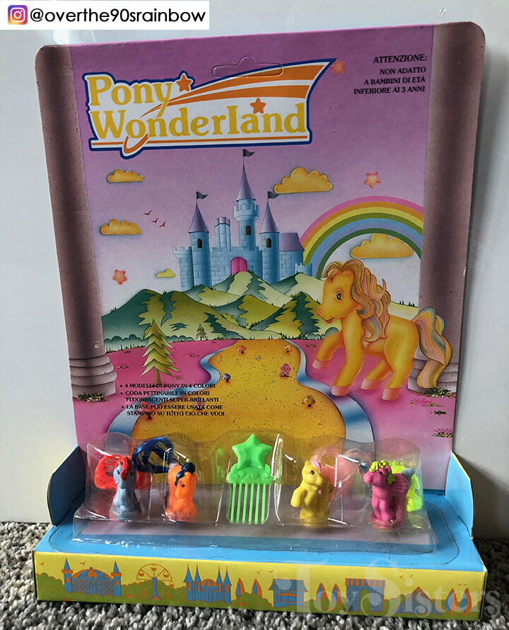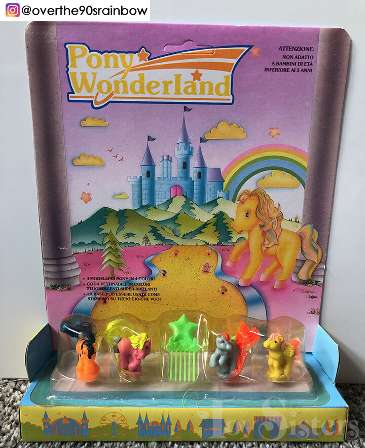 In Europe, a company named Globo produced fakie My Little Pony stampers using the Petite Pony molds.  The line was called Pony Wonderland.  They created 32 different ponies.  Thank you to overthe90srainbow for most of these pictures and for sharing her knowledge about the line.