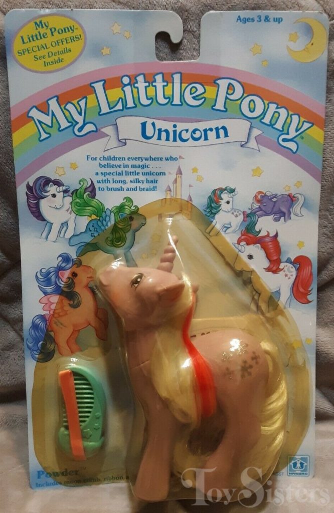 Powder was released in 1984 and is a Unicorn Pony. She came with a blue moon comb and pink ribbon. She is in the Powder Pose. To view other ponies by year/series, click here.
