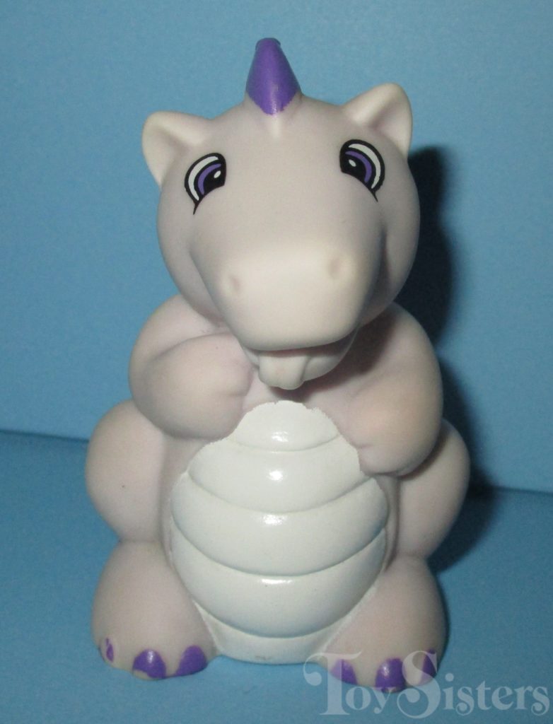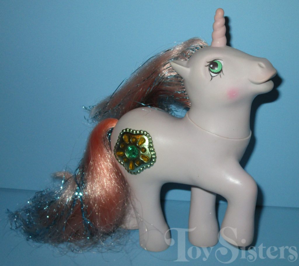 Princess Sparkle was released in 1987 and is a Princess Pony. She came with the Bushwoolie Hugster. She also came with a damsel hat, wand, ribbon, and comb. I have seen variations in her hair shade and tinsel colors. These variations have all been US releases with no differences in their hoof/manufacturer markings, so these differences are mostly likely attributable to different factory runs. In the UK her name was Princess Amethyst and instead of a Bushwoolie she came with a Dragon named Spiny. In Germany, she was released with pink hair. She is in the Milky Way Pose. To view other ponies by year/series, click here.