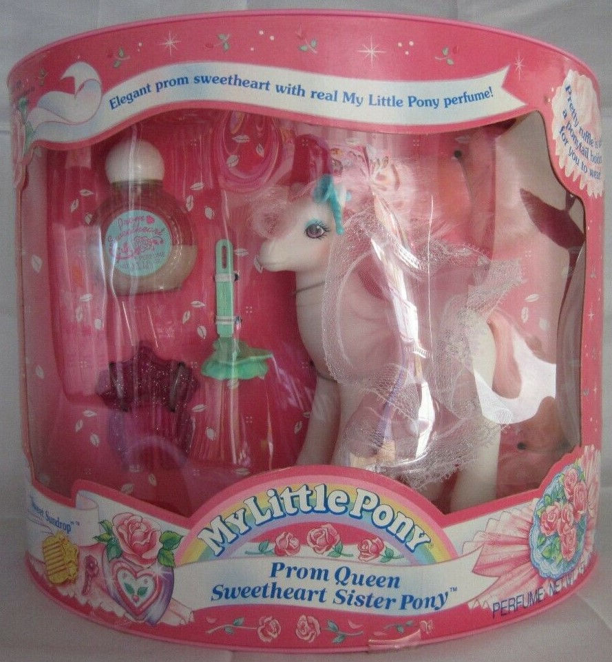 Sweet Sundrop was released in 1990 and is a Prom Queen Pony. She came with a dark teal flower barrette, dark magenta star comb, perfume bottle, and pink skirt. She is in the Spring Song Pose. To view other ponies by year/series, click here.