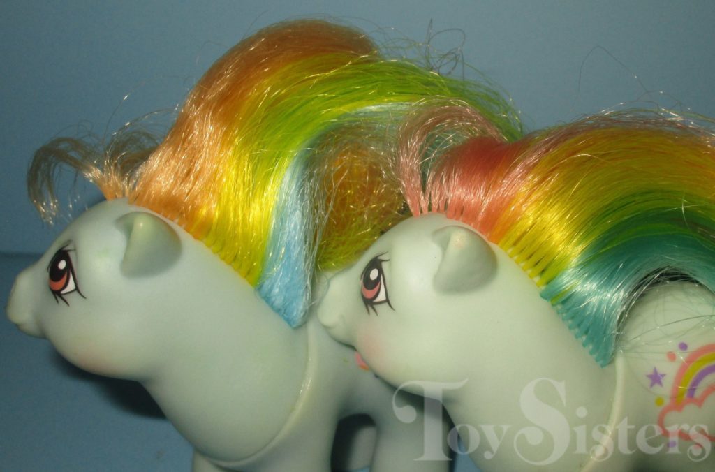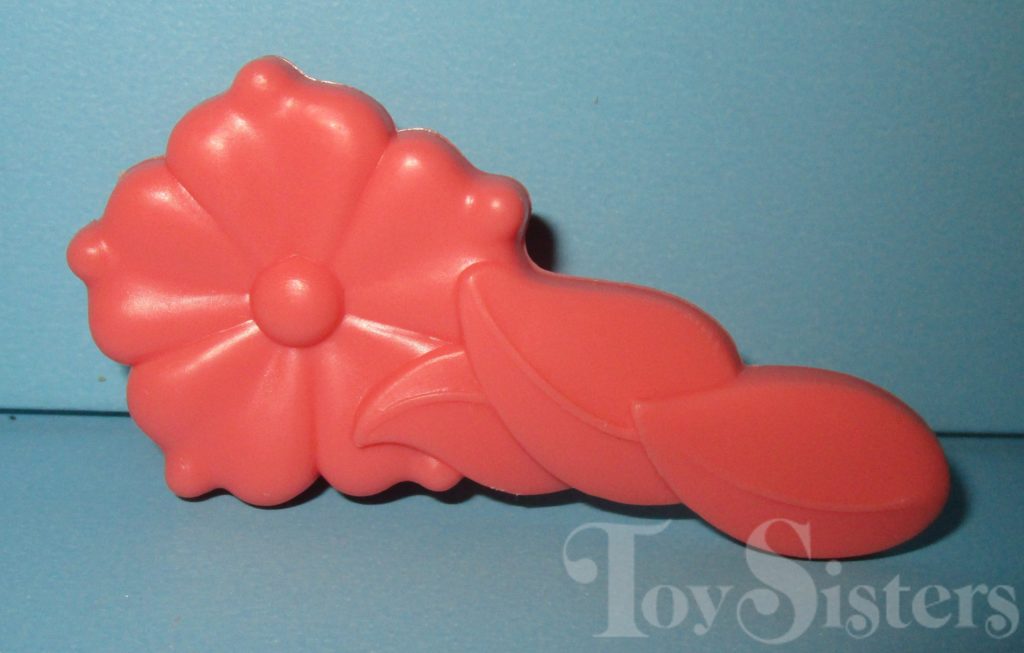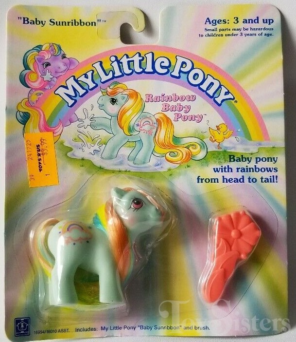 Baby Sunribbon was released in 1991 and is a Rainbow Pony. She came with a red orange flower comb or a red orange star comb. In the UK, the colors in her hair were slightly different (there are no hoof stamp differences though). She is in the Baby Ember Pose. To view other ponies by year/series, click here.